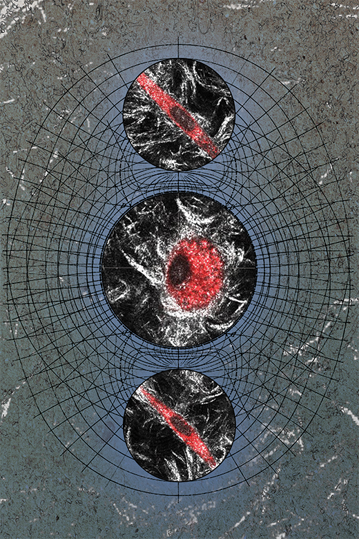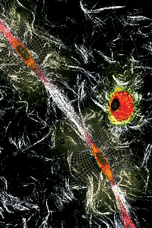 The images depict the mechanical interactions of colorectal cancer-associated fibroblast cells (CAFs) as they mechanically change the tumor microenvironment, thereby facilitating cancer cell migration. With the layering of force diagrams and meshes, the artist highlights the tension the red stained CAFs apply to nearby cells. While the collagen fibers between the cells are stretched to form a thick white band, the surrounding fibers buckle from this tensile force. Going forward, these fundamental studies exploring the forces at play in the tumor microenvironment are the first push in a cascade of further research, with the goal to eventually develop improved cancer therapeutics.