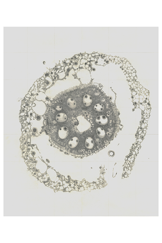In this hand-drawn piece, the artist pays homage to the beauty of resilience. Each precise mark of charcoal comes together to showcase the intricacies in the cross section of the corn root. As you examine the shapes and patterns embedded in the tissue slice, also take notice of the empty space. During drought conditions, the aerenchyma degrades so the plant can save energy and redistribute its power to maintain growth patterns. Fragmented or whole, the corn plant adapts and lives on in a true testament to endurance through flexibility and endurance.