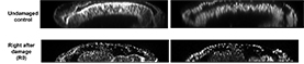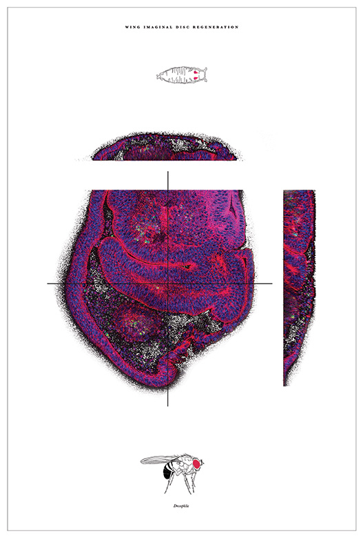 In the study that produced these images, researchers triggered a genetic process that killed cells within the wing imaginal discs of fruit flies. By imaging cross-sections of the recovering imaginal disc, they tracked how the remaining cells—highlighted by their blue centers and magenta outlines—cleared away the debris and repaired the injury. In the final piece, the artist has wrought targeted destruction to reveal hidden processes; a carefully structured order lies beneath seeming disorder.