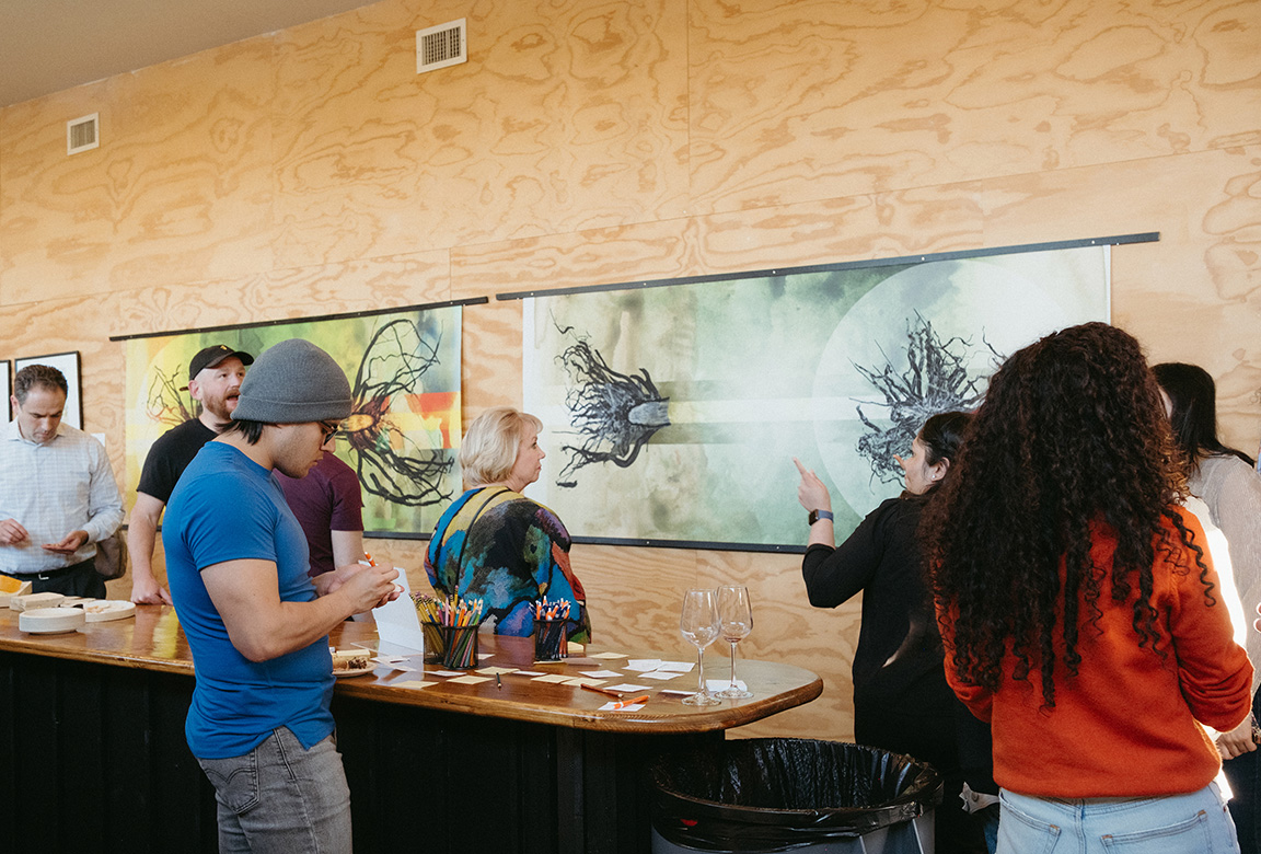 Using layers of watercolor paint, the artist draws attention to the conditions that lead to different growth outcomes. The rich vibrant colors represent plants with sufficient water intake in contrast to the bleak colors of drought in the second image. As you observe the images in the pieces, what differences do you notice? Are there changes in the size, shapes, angles, and thickness of the roots? By coupling physical observation with genomic data, we look towards building a resilient, food secure future where both plants and humans can thrive.