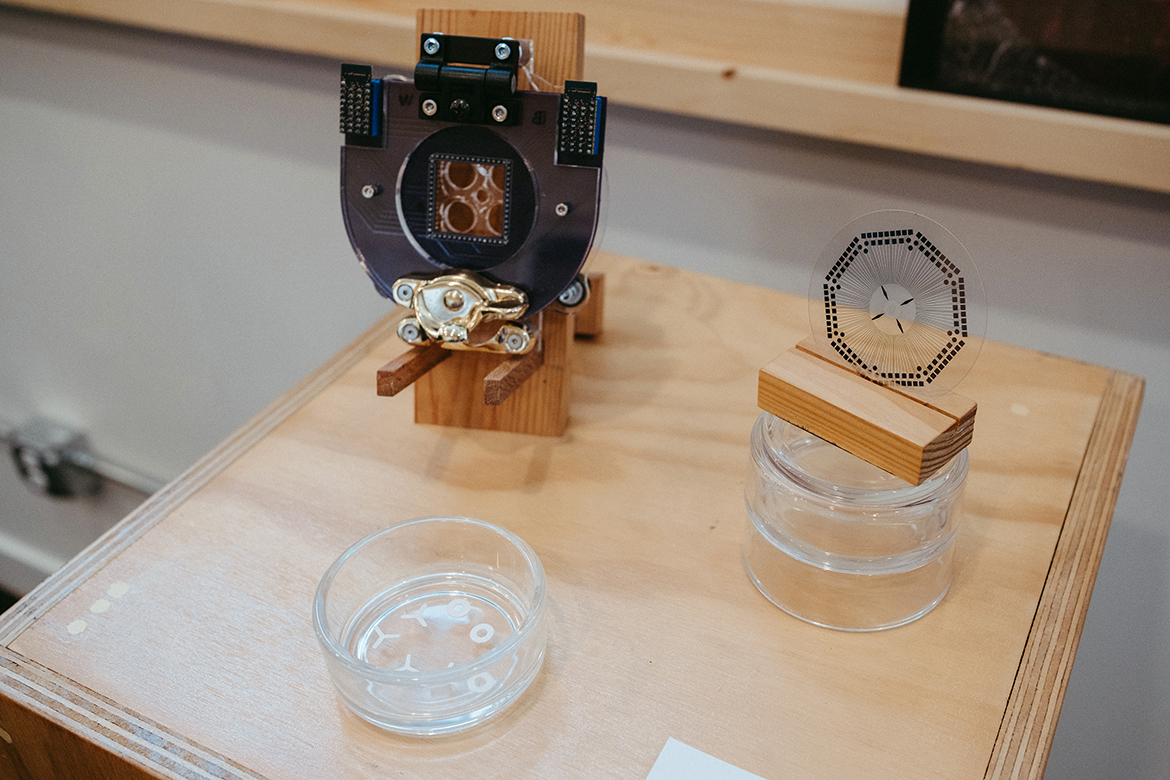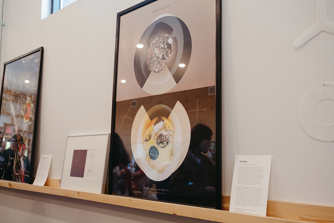 Inspired by the style of Hilma af Klint, the artist has accentuated the polarity of the data, mapping the contrasting scientific images in opposition to each other. When the red viral particles roam free, the cell membrane is vulnerable to the virus, with its penetrability represented by a superimposed image of a broken egg shell. In contrast, when restrained and shielded in the claws of the NanoGrippers, the red virions disappear as SARS-CoV-2 is rendered inactive and unable to enter the cell to cause infection—the egg shell left intact. In the arms race against viruses, perhaps we can rig the game after all through the development of these precision molecular machines.