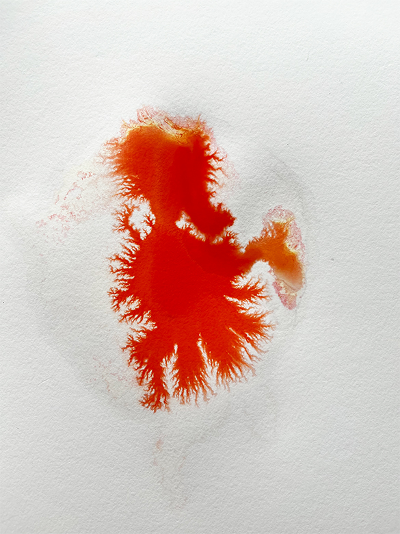The fertilized egg begins its existence in a state of transience, migrating from the fallopian tube to the uterus. Its survival depends on preparations that predate conception: the inner lining of the uterus thickens, the cells multiplying in preparation for a zygote that may never arrive. If it does, the uterine lining will provide it with a place to anchor and the nutrients it needs to grow. If it does not, the lining will be shed and the reproductive cycle will resume. A symphony of hormonal signaling leads the uterine lining’s cellular dance of proliferation and loss. The artist used pen and ink to draw the viewer into these hidden spaces, defined by what is absent as much as what is present, empty but loaded with potential.
