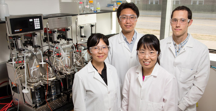 IGB faculty and food science and human nutrition professor Yong-Su Jin, left rear, and clockwise, graduate student Joshua Quarterman, EBI Fellow Soo Rin Kim and postdoctoral researcher Na Wei.