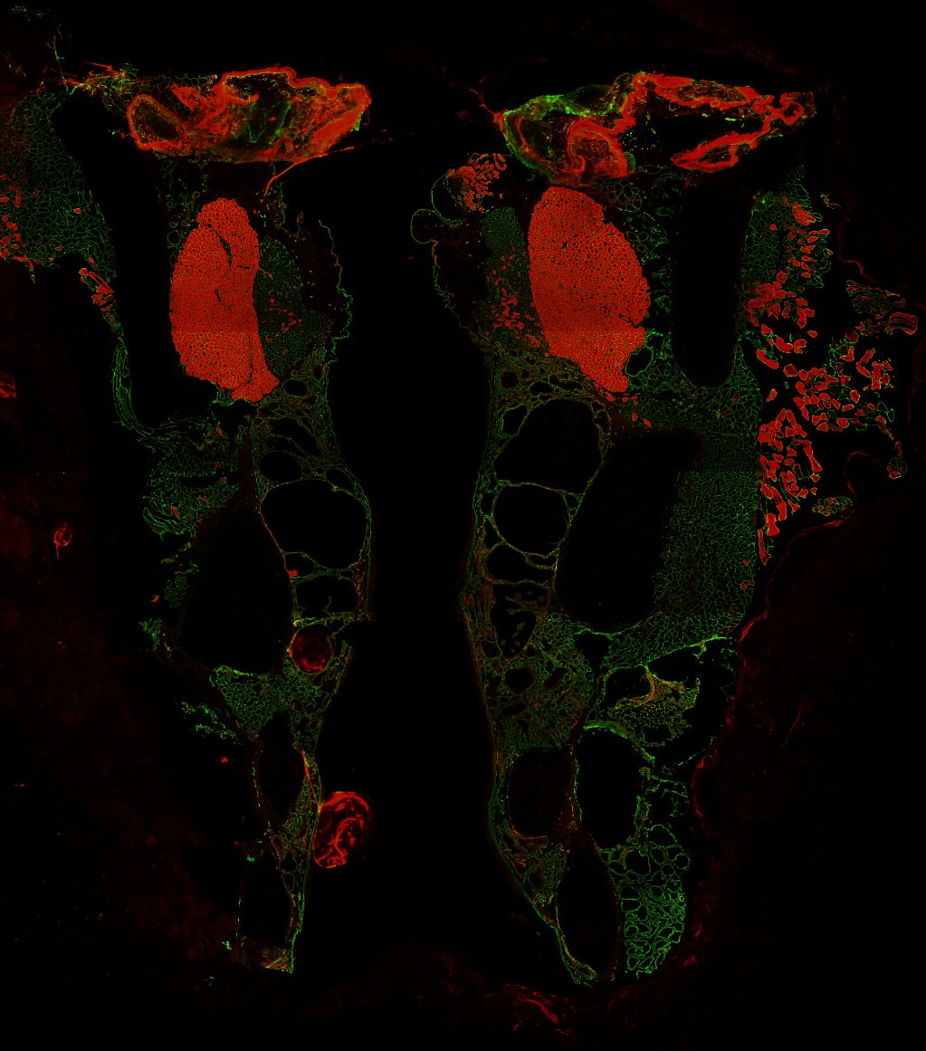 This image shows a coronal section of a whole rat larynx. Muscle fibers are outlined in green and type IIb muscle fibers are stained red in the paired lateral thyroaryntenoid muscles (part of the vocal folds).