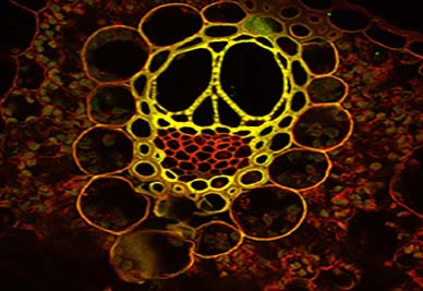 This image shows a sugarcane vascular bundle using two-photon excitation fluorescence with second harmonic generation.