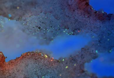 This image shows the distribution and locations of nucleic acids in ancient travertine (calcium carbonate). A selective nucleic acid staining was done using a combination of SyBr Green and Hoechst Nucleic Acid stains. The image was taken using the AXIO ZOOM V16 microscopy.