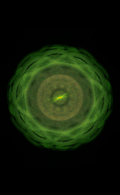 Structured illumination superresolution imaging technique breaks the diffraction limit of light by half in optical microscopy which was held over a century. Cellular structures and proteins now could be visualized up to 120 nm in XY and 250 nm in Z axis. By creating Moiré fringes using a known patterned illumination over the samples information beyond the conventional field of view is transferred into the actual viewable field. This enhanced information is calculated in the frequency space using a set of sophisticated Fast Fourier Transformation (FFT) algorithms. The image is a three dimensional FFT of 19 optical sections of a cell labeled for visualizing actin in single fluorescent channel processed to emphasize the signal-to-noise ratio in 3D.