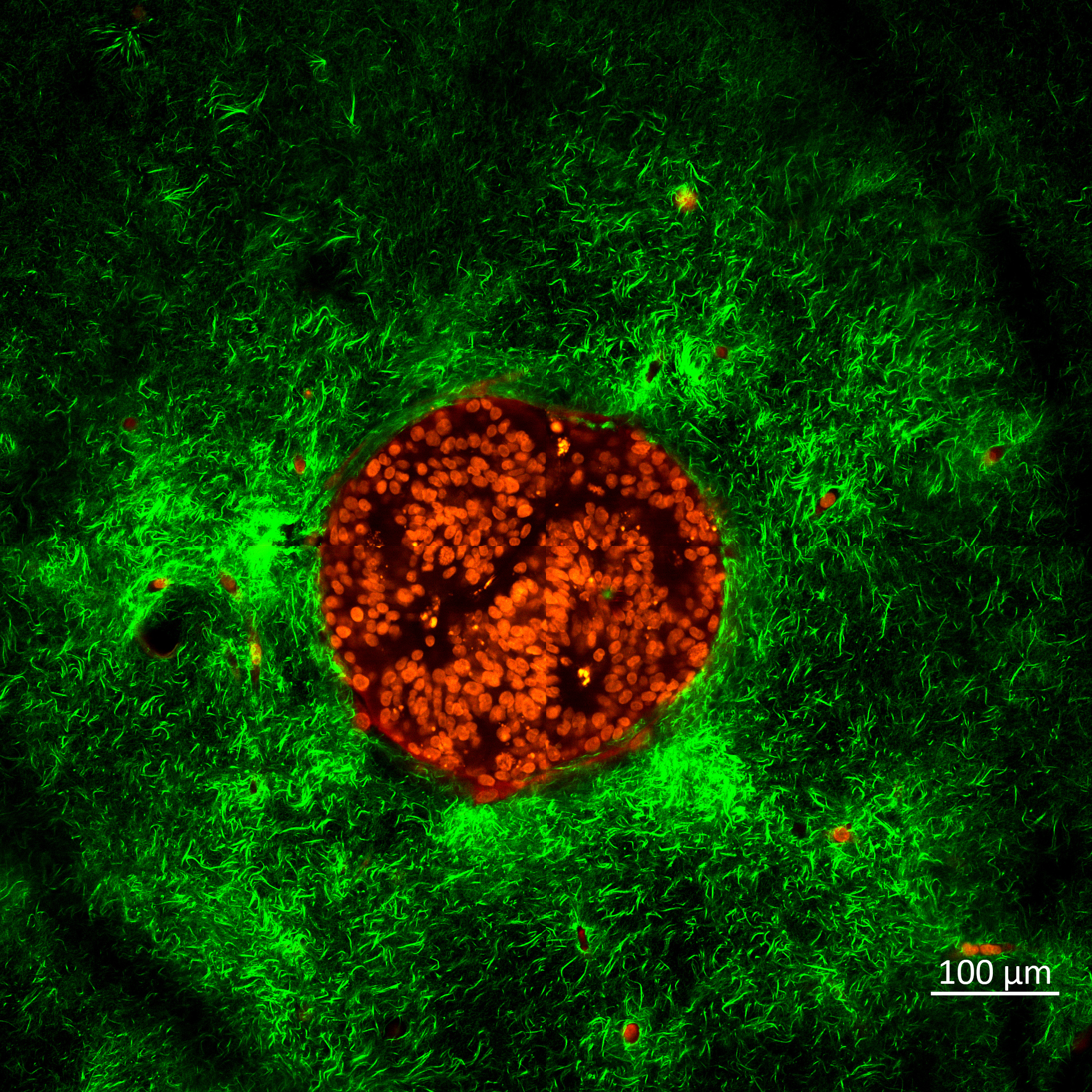 “This is a SHG image of a FET colorectal cancer cell spheroid embedded in a 3D type-I collagen gel. The nuclei of the cancer cells at the center are stained with DAPI. This experiment shows how cancer spheroids reorganize collagen fibers around them through mechanical interaction with the fibers.”