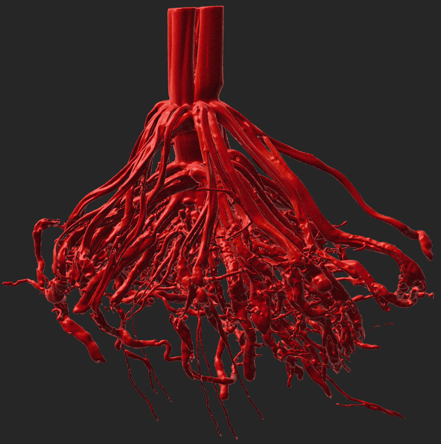 This crown root from biomass sorghum grown in the field under restricted water supply using our rain-out facility as part of the CABBI project. This Image was taken using the X5000 NSI High-Resolution Micro-CT and rendered in Imaris at the Carl R. Woese Institute for Genomic Biology Core facility.