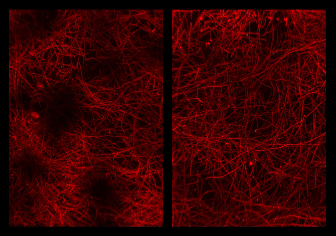 Tissues from mouse medial prefrontal cortex were cleared by CLARITY and stained with anti-proteolipid protein. Images were taken on the LSM 710 and 3D renderings were created using Bitplane Imaris software. This technique allows 3D visualization and quantification of myelin in the prefrontal cortex. Left: maximal demyelination due to cuprizone neurotoxin. Right: partial remyelination one week later.