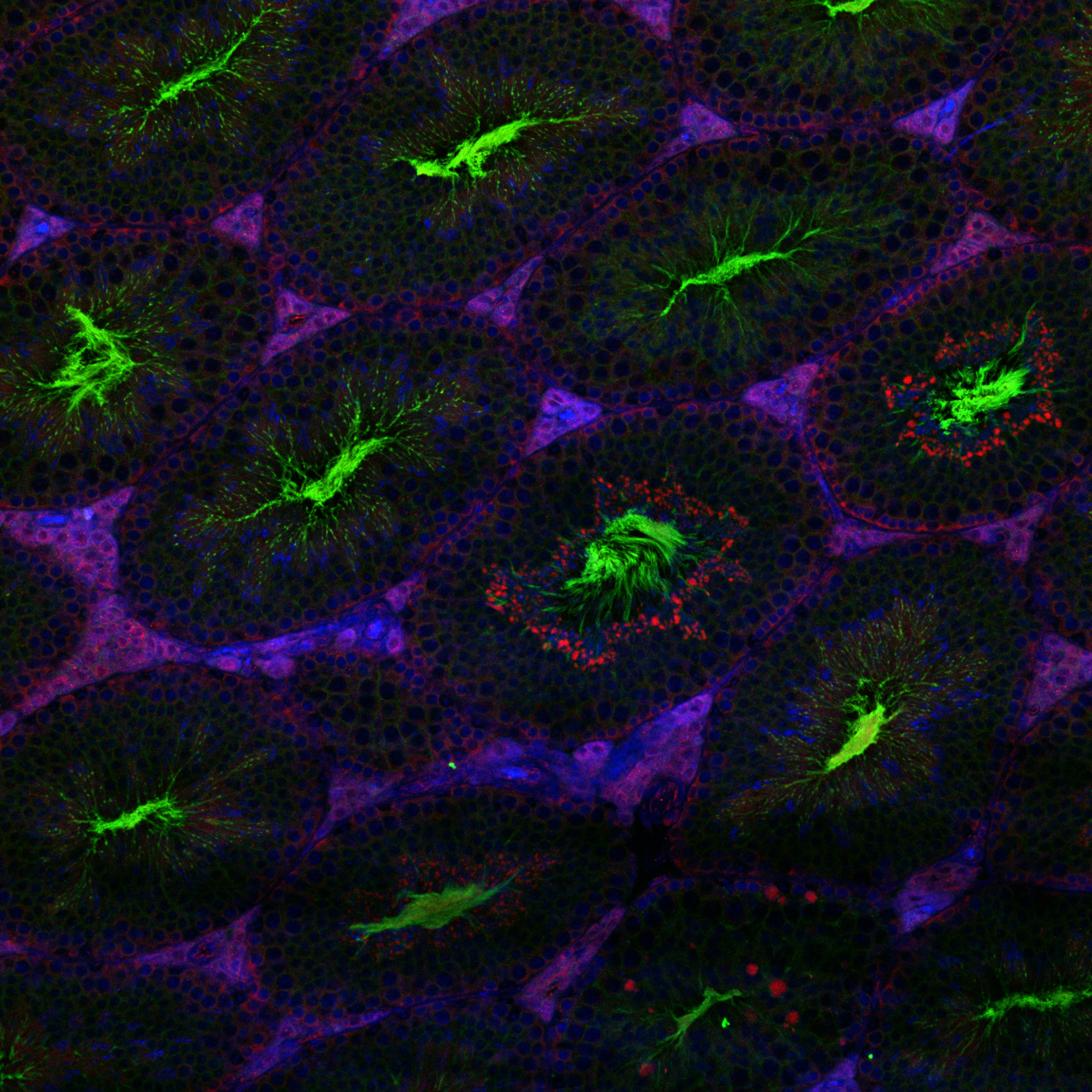 A cross section of mouse testis showing germ cells and spermatogenesis. The green color is basigin expression, which is a cell membrane protein. The red color is claudin-4 expression, which is an epithelial tight junction protein. The blue color is DAPI staining of nuclei. The picture is taken on confocal microscope Zeiss LSM 710. The tubule structures are seminiferous tubules, and that is where spermatogenesis occurs. In each seminiferous tubule, there are 4-6 layers of germs cells at different developmental stages. In the lumen, the bright green color represents the tails of spermatozoa. The red colors in the lumen represent mature spermatozoa. The interstitial cells between each seminiferous tubule are Leydig cells and they produce male sex hormone testosterone, which is essential for normal spermatogenesis and maintaining male characteristics.