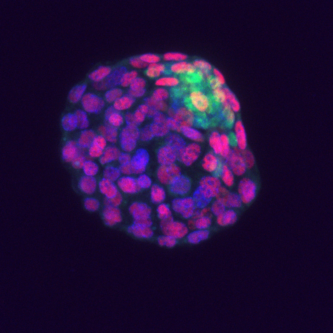 Mouse blastocyst exposed to 100 µM MEHP in vitro. The green color represents Oct-4 expression, a marker for inner cell mass; the pink color represents Cdx-2, a marker for trophectoderm, and blue represents Hoeschst staining of nuclei. MEHP is an endocrine disrupting chemical used in plastics manufacture that can interfere with normal hormone action in the body. The aim of this study is determine whether MEHP exposure can negatively impact early embryonic development through examination of changes in morphology, distribution of different cell types and expression of particular proteins in mouse embryos at different stages of development. This project is being conducted by Rachel Braz Arcanjo, under the supervision of Dr. Romana Nowak of the Reproductive Health and Toxicology Laboratory in the Department of Animal Sciences. Mouse blastocyst exposed to 100 µM MEHP in vitro. Picture taken on confocal microscope Zeiss LSM 880 using Z-stack feature.