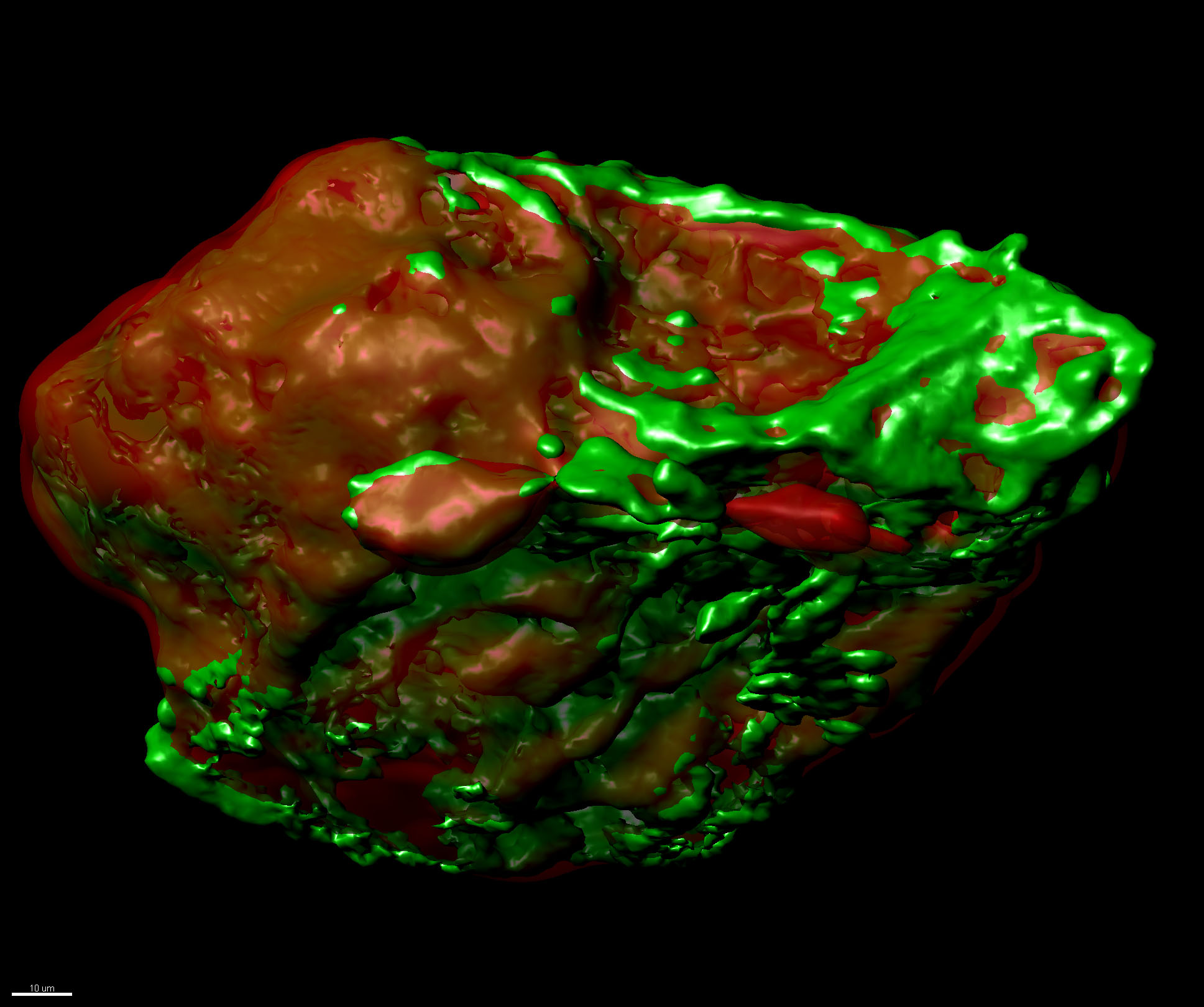 The Computer Tomography image processed for Isosurface in Imaris program showing a piece of jasperoid, which is an aggregate of quartz and Fe-oxide (hematite) crystallites. The Fe-oxide contains radiogenically created He atoms that could be used to determine the age of the jasperoid if the three-dimensional distribution of He atoms can be properly cataloged. These images, along with numerical modeling, will aid in that process. Jasperoid is often associated with economically important ores, such as gold, and so understanding a jasperoid’s age could help with mineral exploration.