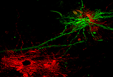 Imaging 3D structure of pollen is important in identification of the pollen species. The LSM 880 Airyscan system provides around 140nm resolution with 405nm excitation. Using the superior sensitivity and resolution of the Airyscan detector, the spikes, surface structure, entine and exine are clearly resolved through the entire depth of the pollen (~40 micron through the Z). The Sunflower (Helianthus sp.) pollen was labeled with Phloxine B and processed after collection (Helianthus sp.) from the Burlington, NC area.