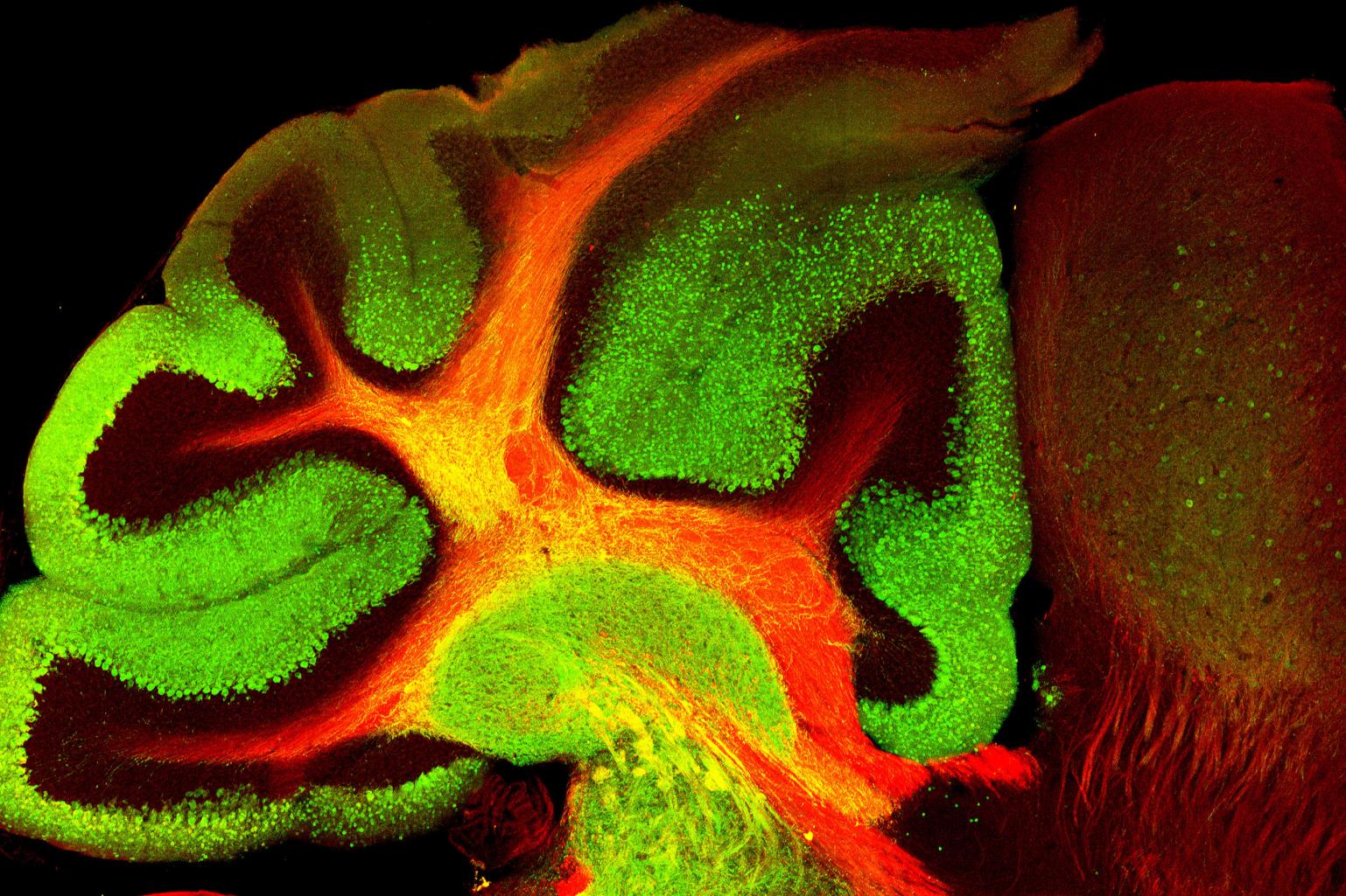 The red channel shows IHC for a transcription factor involved in neuron differentiation and social learning, Ttf1.