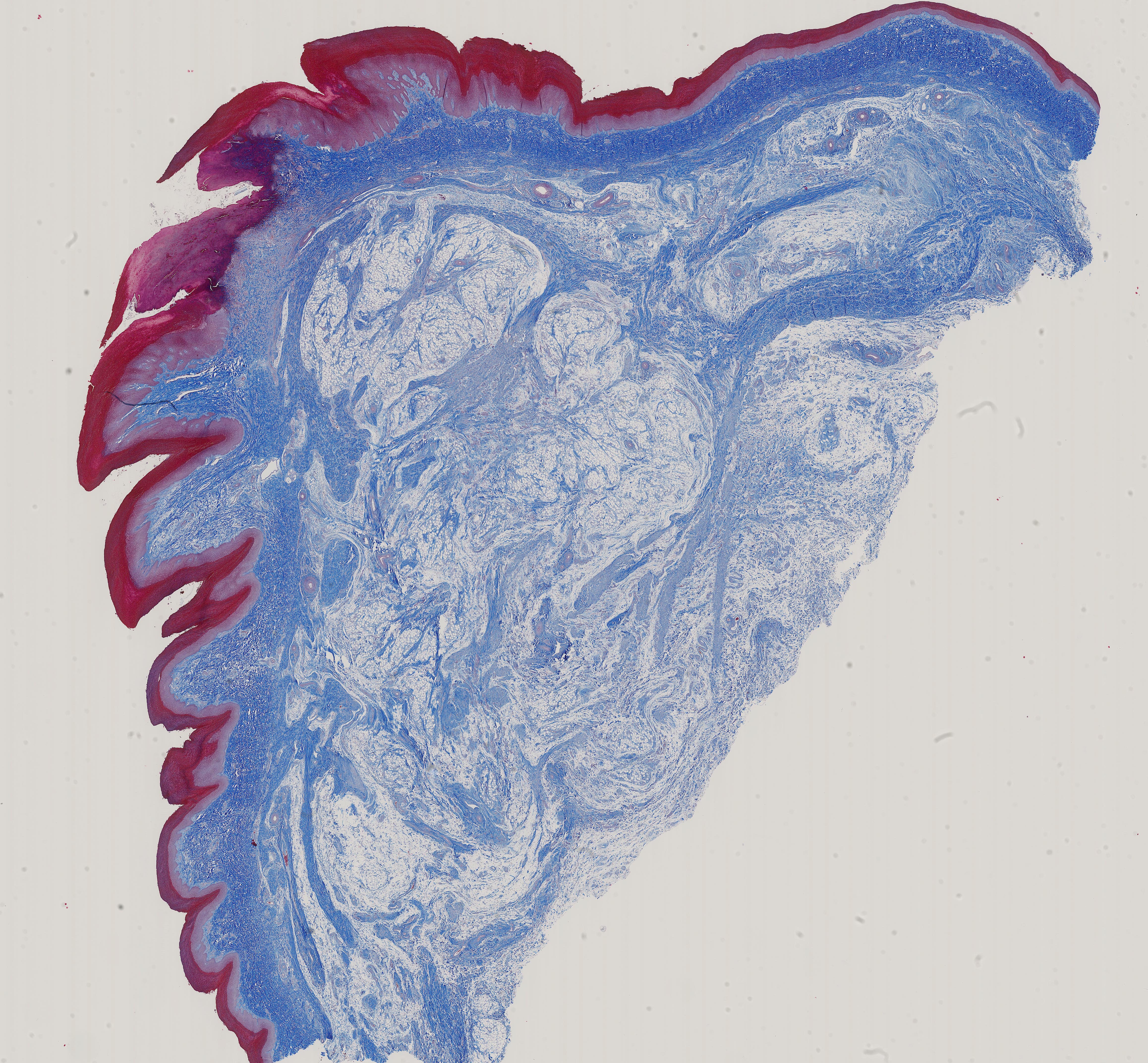 Masson trichrome staining of chicken footpad skin. The footpad skin of chicken feet is covered with multiple reticular scales that have a papillary form. The structure of these papillae includes a thick outer layer called stratus corneum (brown) followed by epidermis (pink), dermis (blue), and subcutaneous tissue (blue and white). Chicken feet or paws have become the third most important economic part of the chicken, with chicken paws accounting for approximately $280 million a year. Footpad dermatitis (FPD) is a type of skin inflammation that causes necrotic lesions on the plantar surface of footpads in broilers and turkeys, which causes downgrades and condemnations of saleable chicken paws. Novus International is studying the structure integrity of footpad skin and pathology of FPD, in order to provide nutritional strategies to prevent and/or intervene development of footpad lesions and promote wound healing in commercial poultry.