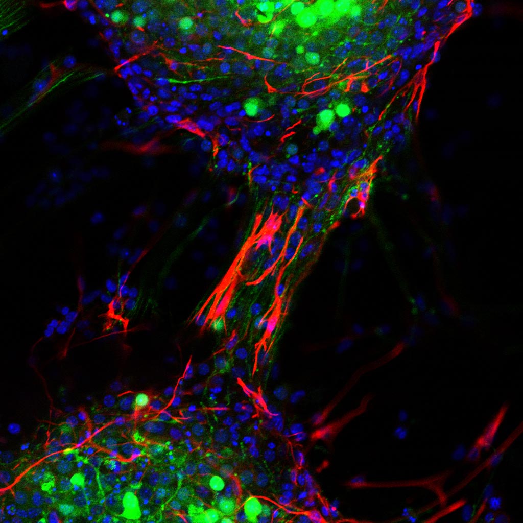 This image, taken with the LSM 710 confocal microscope, shows two embryoid bodies (EBs), which are spherical aggregates of pluripotent cells that can be differentiated into the three germ layers. The EBs in this image are composed of mouse embryonic stem cells that have been differentiated into motor neurons (green) and glia (red); nuclei are stained in blue. Over time, the cells extend neurites across the underlying collagen substrate to form synapses with each other. This research is supported by an NSF-funded STC, Emergent Behaviors of Integrated Cellular Systems (www.ebics.net).
