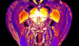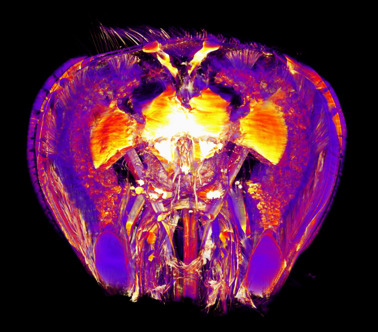 This is a 3D reconstruction of Osmium-stained dissected head of a worker bee. The intact brain is highlighted in the center and resolved at 2 microns. The reconstructed volume was taken using the X-ray tomograph from the NSI X-5000 located at the Carl R. Woese Institute for Genomic Biology.