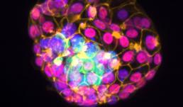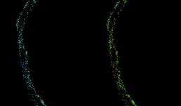 “This is a SHG image of a FET colorectal cancer cell spheroid embedded in a 3D type-I collagen gel. The nuclei of the cancer cells at the center are stained with DAPI. This experiment shows how cancer spheroids reorganize collagen fibers around them through mechanical interaction with the fibers.”