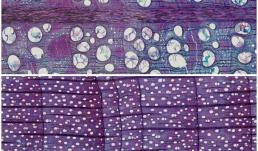 These images are transverse sections of stem-wood from two temperate deciduous tree species from Manistee, Michigan. The top image is from a White Oak (Quercus alba) tree while the bottom image is a Sugar Maple (Acer saccharum) tree. These sections were used in a study analyzing how ray parenchyma cells in wood are related to radial wood nutrient translocation within trees. The ray parenchyma can be identified as the long lines of symplastically connected cells that span across each section. Additionally, the Oak species on the top depicts a band of multiseriate rays that are multiple ray parenchyma wide. These cells are hypothesized to influence radial nutrient translocation within sapwood and are tied to many other plant functions such as the storage of non-structural carbohydrates (NSCs) and plant defense compounds.