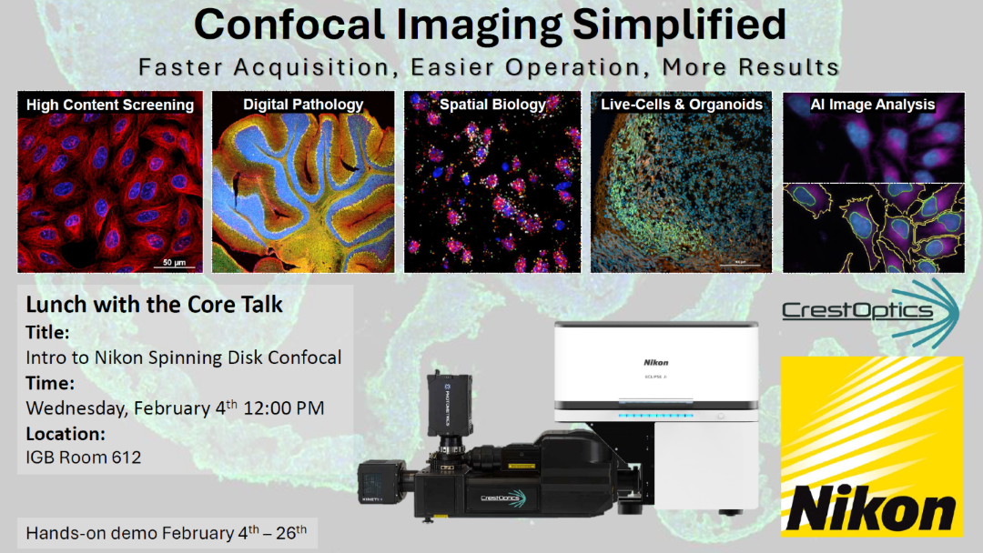 Nikon, Crest Optics, and the IGB Core Facility are pleased to host a special Wednesday Session of Lunch with the Core followed by a hands-on demonstration featuring Nikon's latest advancements in automated high-speed confocal microscopy.