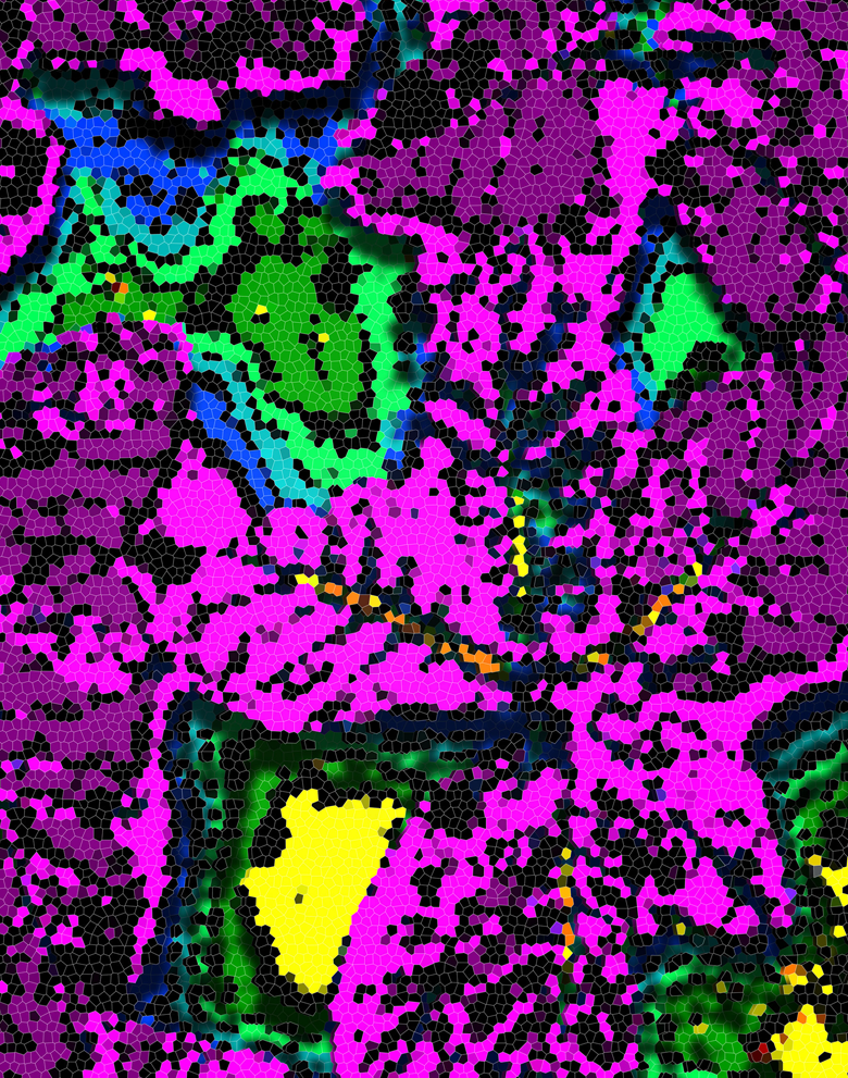 This patchwork of colors is a thermal image of tobacco plants taken at noon during mid-July. The leaf veins dominate the image foreground, while the warm soil provides the image’s backdrop. These plants have very large leaves, which means the plant has more surface area in between the veins to transpire or “sweat,” keeping the leaves cooler. Researchers are interested in the processes that keep leaves cool and preserve more moisture to inform the development of water-efficient and drought-resistant crops.