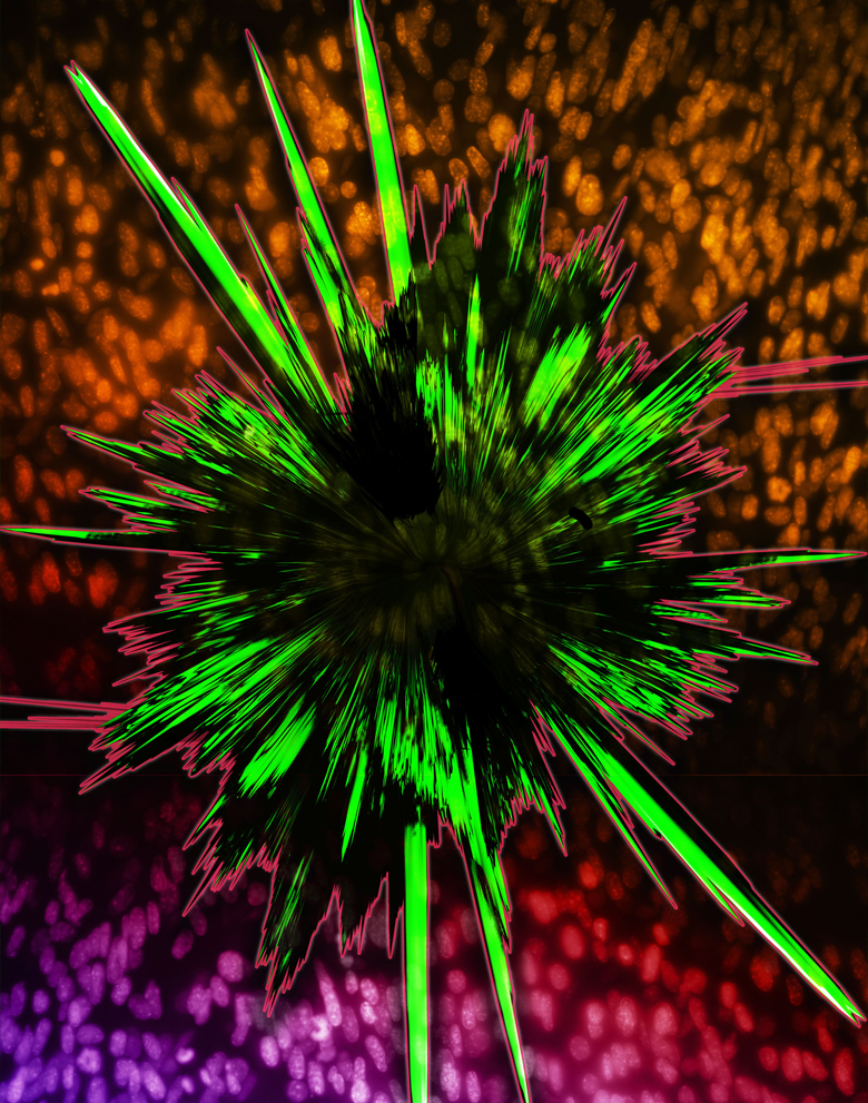 At the interface of physical and medical science lies tissue engineering. Researchers use a combination of biochemical and engineering techniques to coax living tissues to grow according to customized needs: to repair an injury, to create a replacement organ, or to examine tissue properties more easily in the laboratory. The expanding rays seen here were inspired by lab-grown 3D muscle fibers, used by scientists to study the interactions between nerve and muscle tissue.