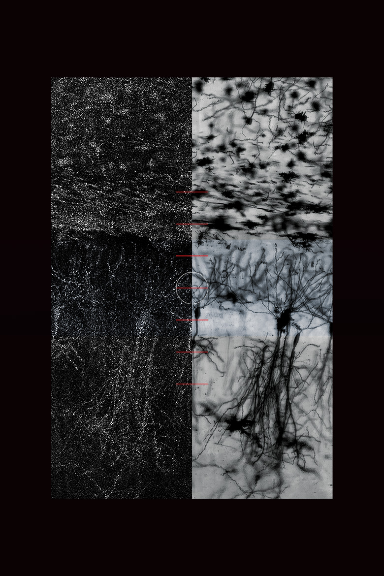 Confocal microscopy, represented in the image, allows us to light up molecules like stars in the night sky. The technique helps scientists observe how cellular components are arranged, creating a picture of zipping molecules in the busy metropolis of a cell. Set up like the abstract tapestries in Barnet Newman paintings, the two sides represent the feeling of a microscope trying to focus from the bigger picture of a mouse hippocampal neuron seen in a bright-field microscope to the inner details brought out by a confocal microscope.