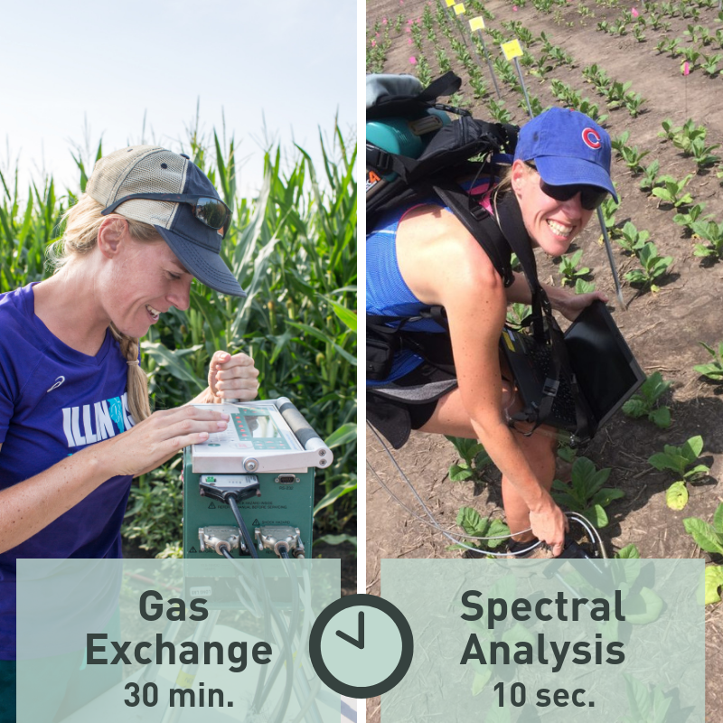 The traditional method for assessing photosynthesis analyzes the exchange of gases through the leaf; it provides a huge amount of information, but it takes 30 minutes to measure each leaf. A faster, or “higher-throughput” method, called spectral analysis, analyzes the light that is reflected back from leaves to predict photosynthetic capacity in as little as 10 seconds.