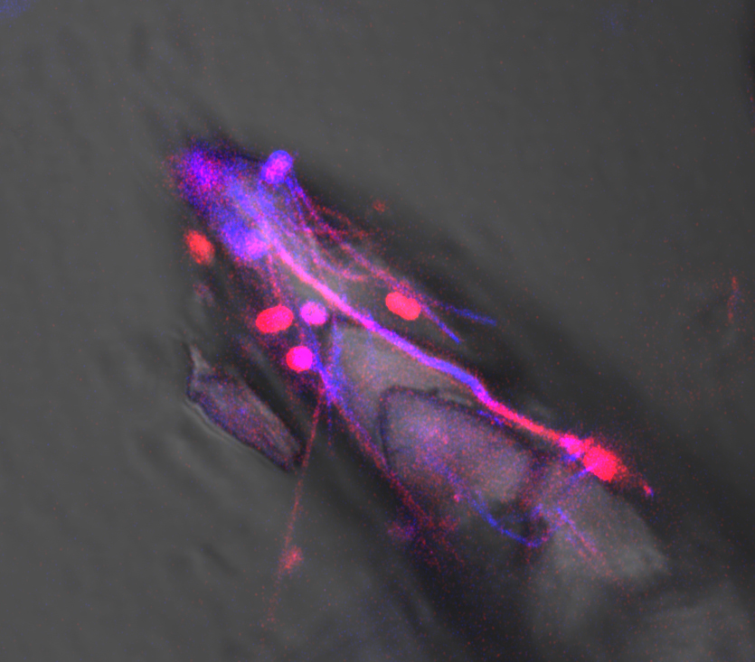 Billion Times Faster: The rate of hot-spring travertine (CaCO3) deposition at Mammoth Hot Springs in Yellowstone National Park is accelerated (catalyzed), reaching crystal growth rates one billion times faster than the rate of CaCO3 deposition in lakes, caves, rivers and oceans around the world. This astonishing rate of precipitation, which amounts to 1 ton of travertine being deposited each day at Mammoth, is driven by the biomolecules produced by heat-loving bacteria (thermophiles) that thrive in the hot springs. This image, which merges transmitted plane-light (brightfield) with Airyscan Superresolution autofluorescence, shows a rapidly extending travertine crystal intimately associated with thermophilic sulfide oxidizing bacterial filaments (Sulfurihydrogenibium yellowstonense) and unknown rod-to-coccoid shaped bacteria.