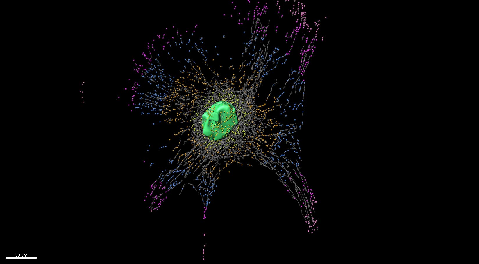 Live Glioblastoma cells expressing a Mitochondrial ROS sensor from Rex Gaskins lab were imaged using the LSM 880 with Airyscan. Imaris was used to create a nuclear surface and identify center of mass points for the mitochondria. A MatLab Xtension was used to classify the mitochondrial center of masses by distance from the nucleus center of mass and color code them accordingly. Colors are as follows: yellow = 0-20um, orange = 20-40um, blue = 40-60um, purple =80-100um, and pink >100um. MatLab Xtenstions greatly expand the functionality of Imaris, please contact Austin Cyphersmith (ajcypher@illinois.edu) if you have questions about using MatLab Xtensions for Imaris in your research.