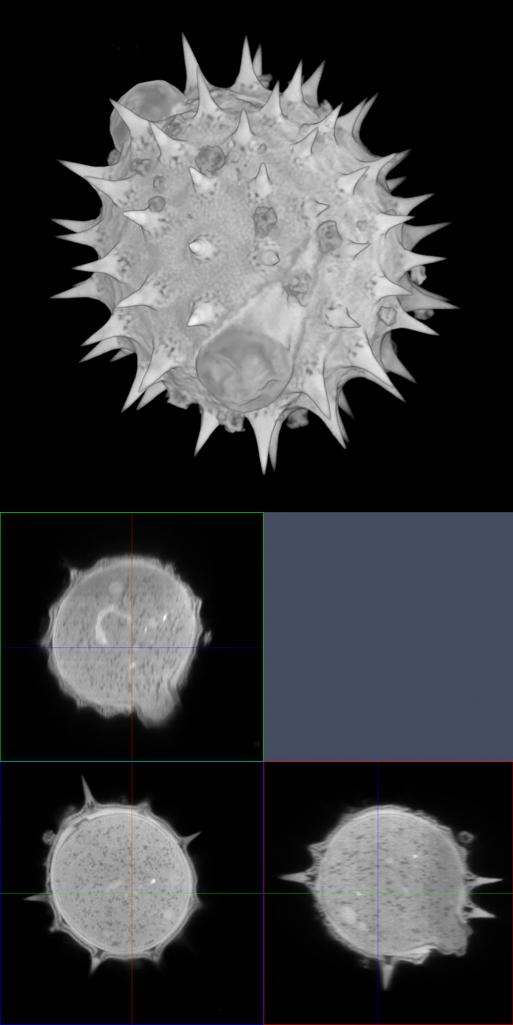 Imaging 3D structure of pollen is important in identification of the pollen species. The LSM 880 Airyscan system provides around 140nm resolution with 405nm excitation. Using the superior sensitivity and resolution of the Airyscan detector, the spikes, surface structure, entine and exine are clearly resolved through the entire depth of the pollen (~40 micron through the Z). The Sunflower (Helianthus sp.) pollen was labeled with Phloxine B and processed after collection (Helianthus sp.) from the Burlington, NC area.