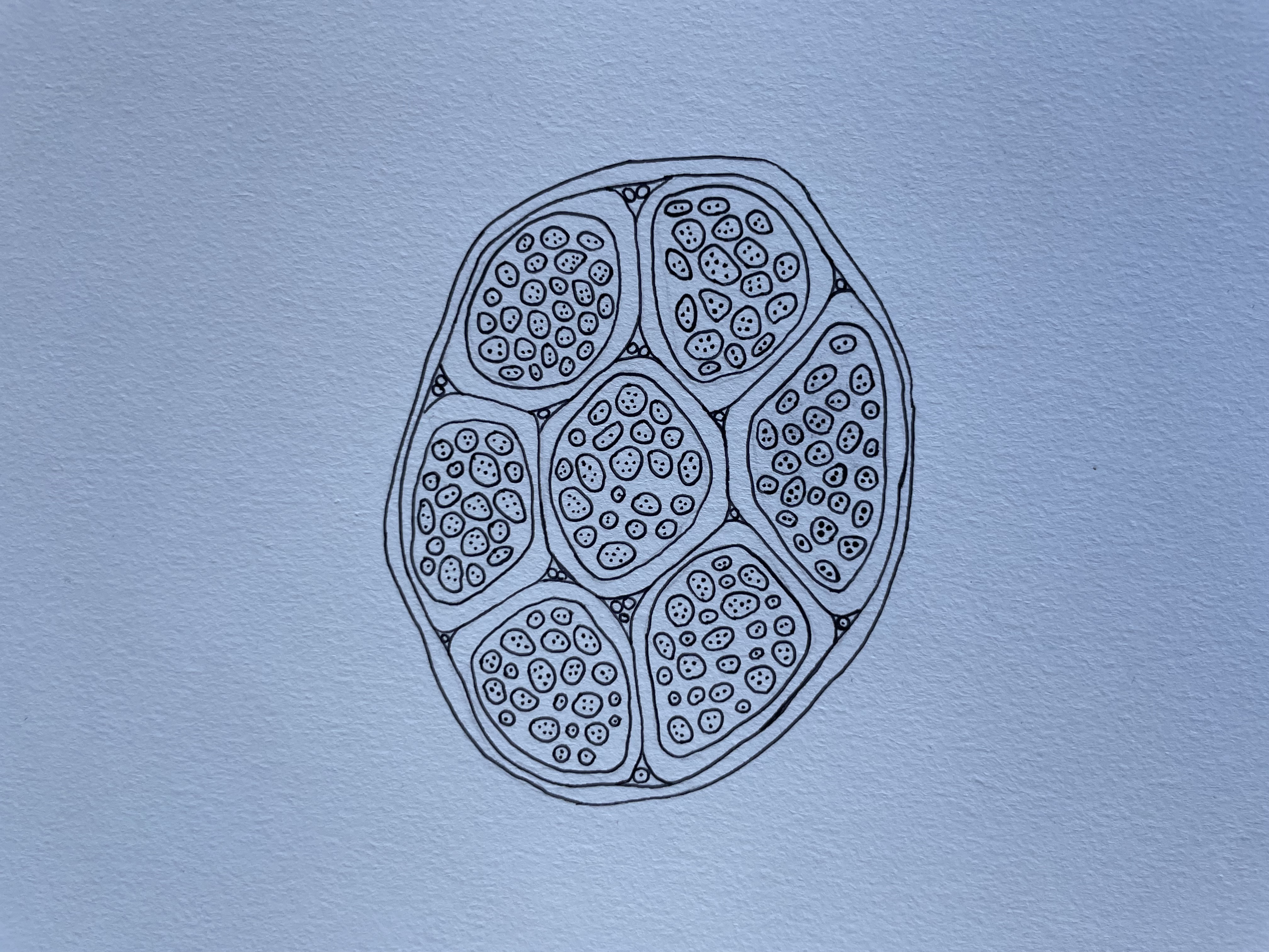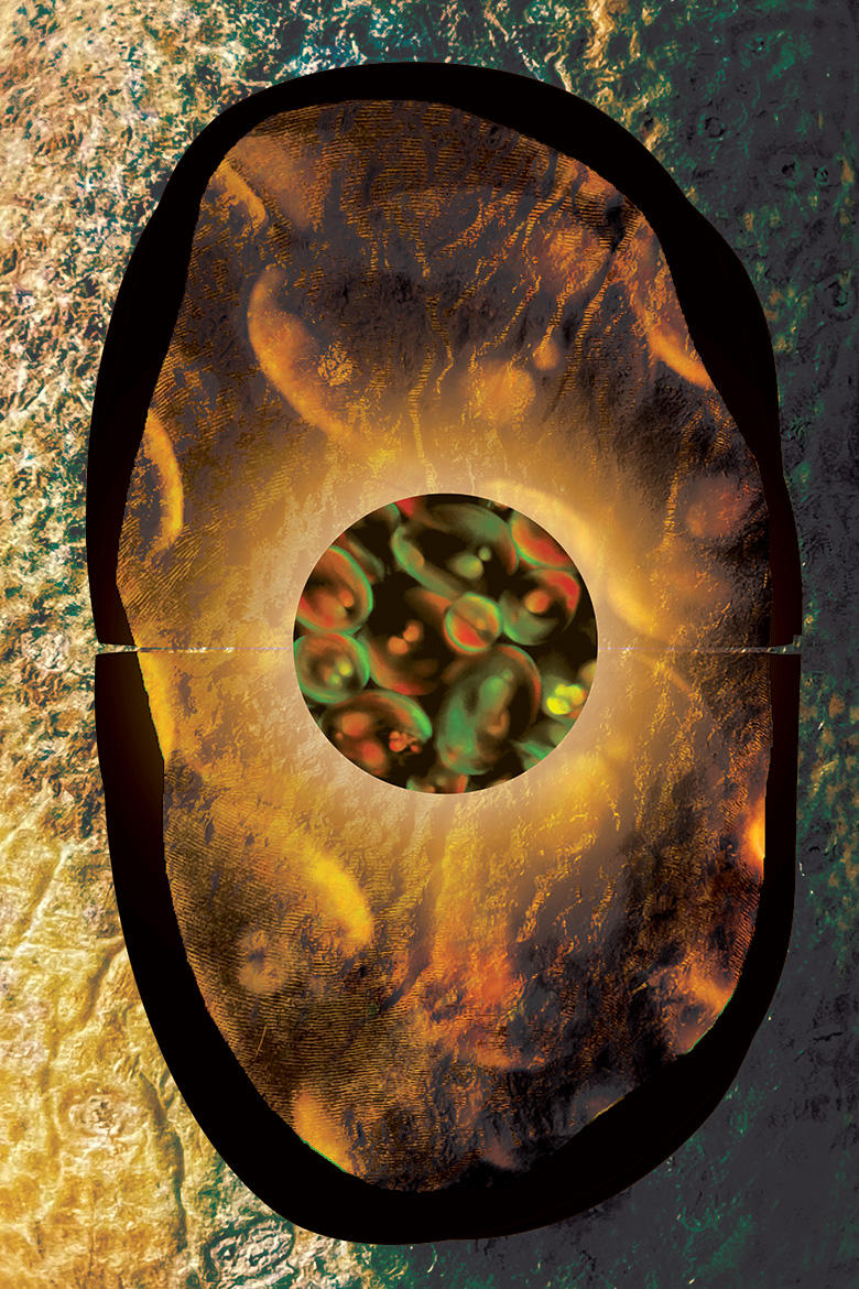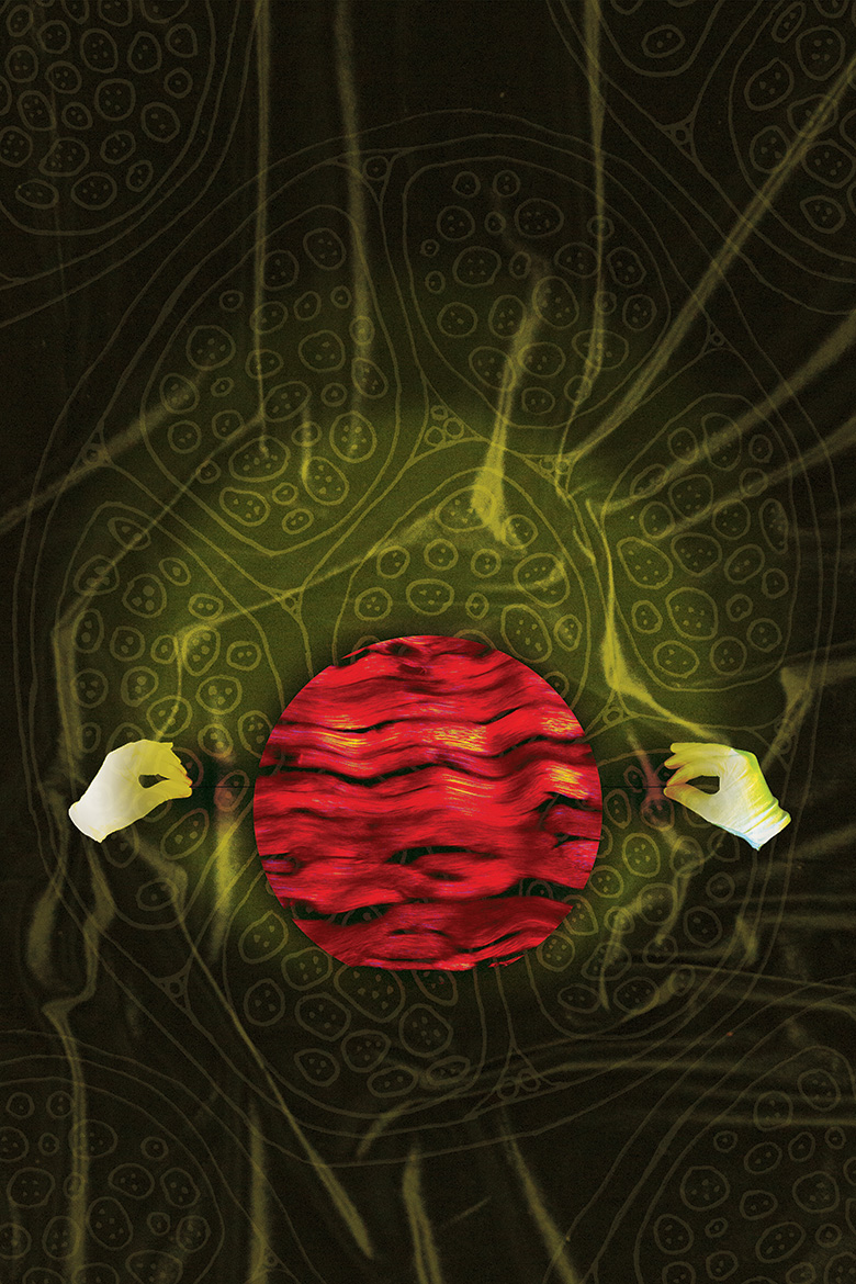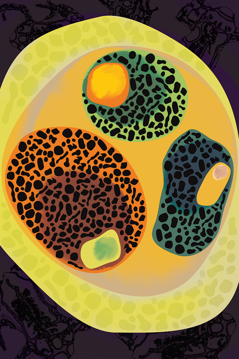 There is a growing need for label-free imaging which allows researchers to peer into the body of plants, animals, and humans without damaging them. One such method is second-harmonic imaging, which takes advantage of the fact that molecules scatter light in distinct ways. In this image, the outer layers of the starch granules in a potato slice, green, can be distinguished from the inner red core. The resulting piece is an homage to different imaging techniques: ink drawings, photographs, and microscope images.