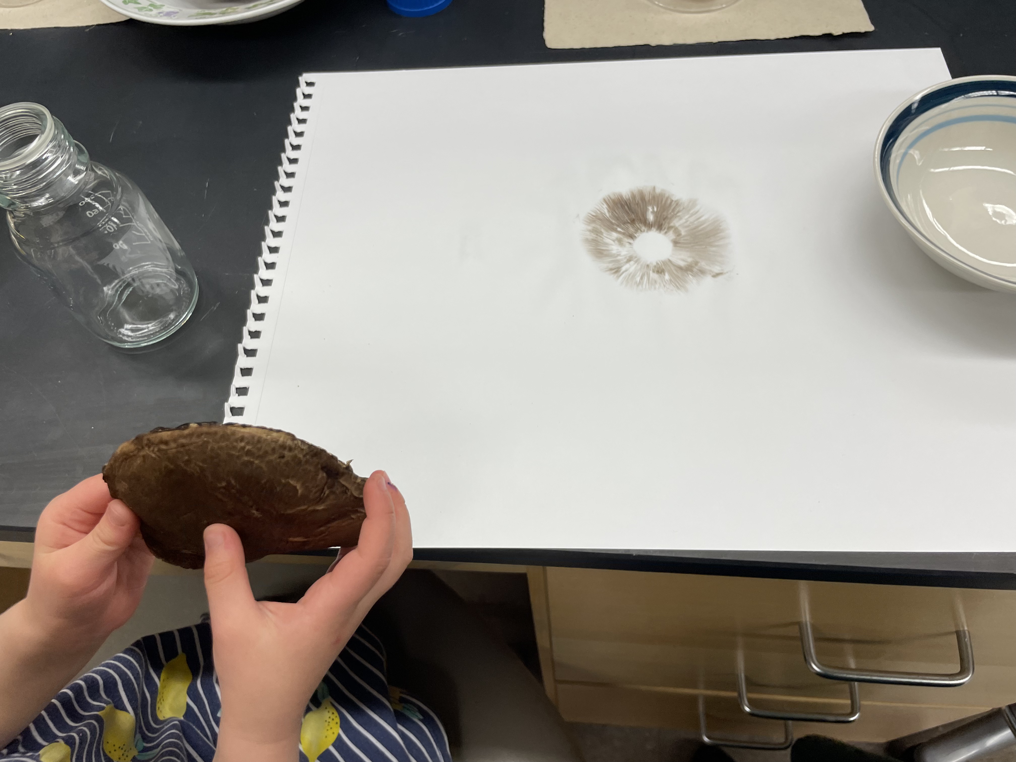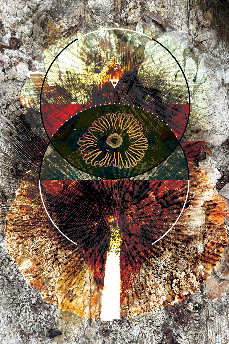 The artist captures these beliefs by layering prints of mushroom spores with microscopy images of mushroom cross-sections. The result is a three-part hierarchical structure: at the base is the stalk of the mushroom that anchors it to the earth’s energy, the center is a gateway for fairies as they dance between our world and theirs, and the peak is the promise of eternal life.