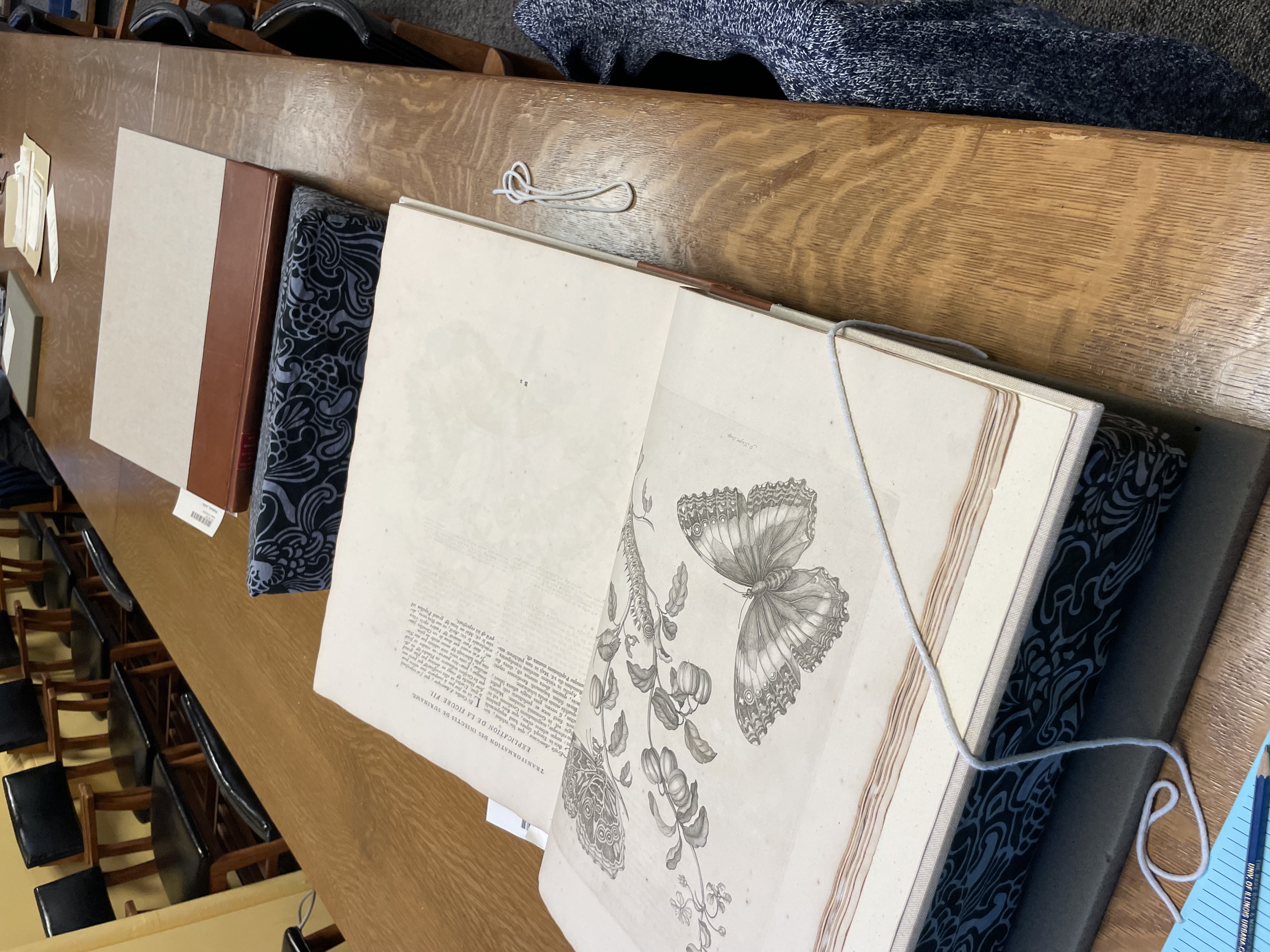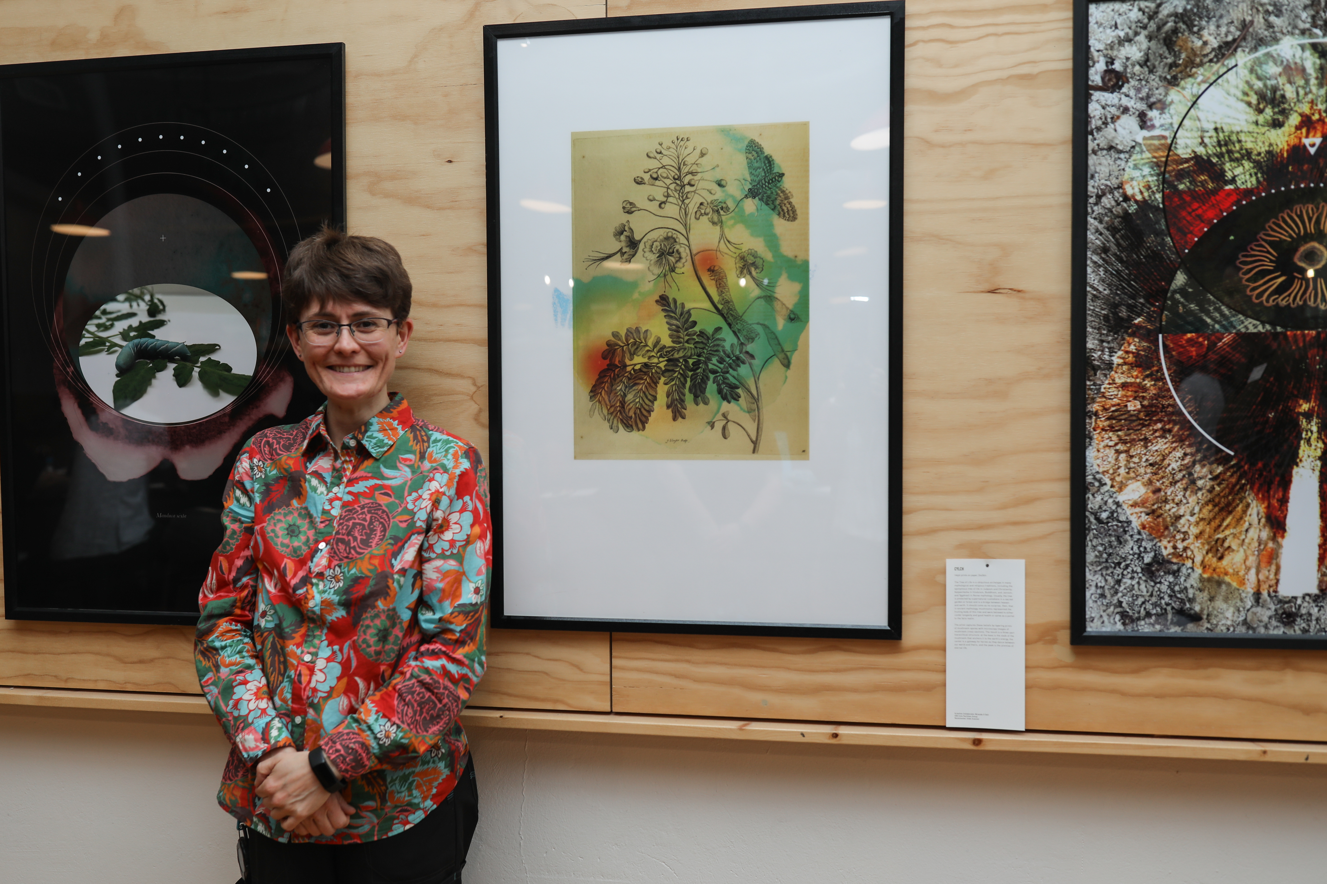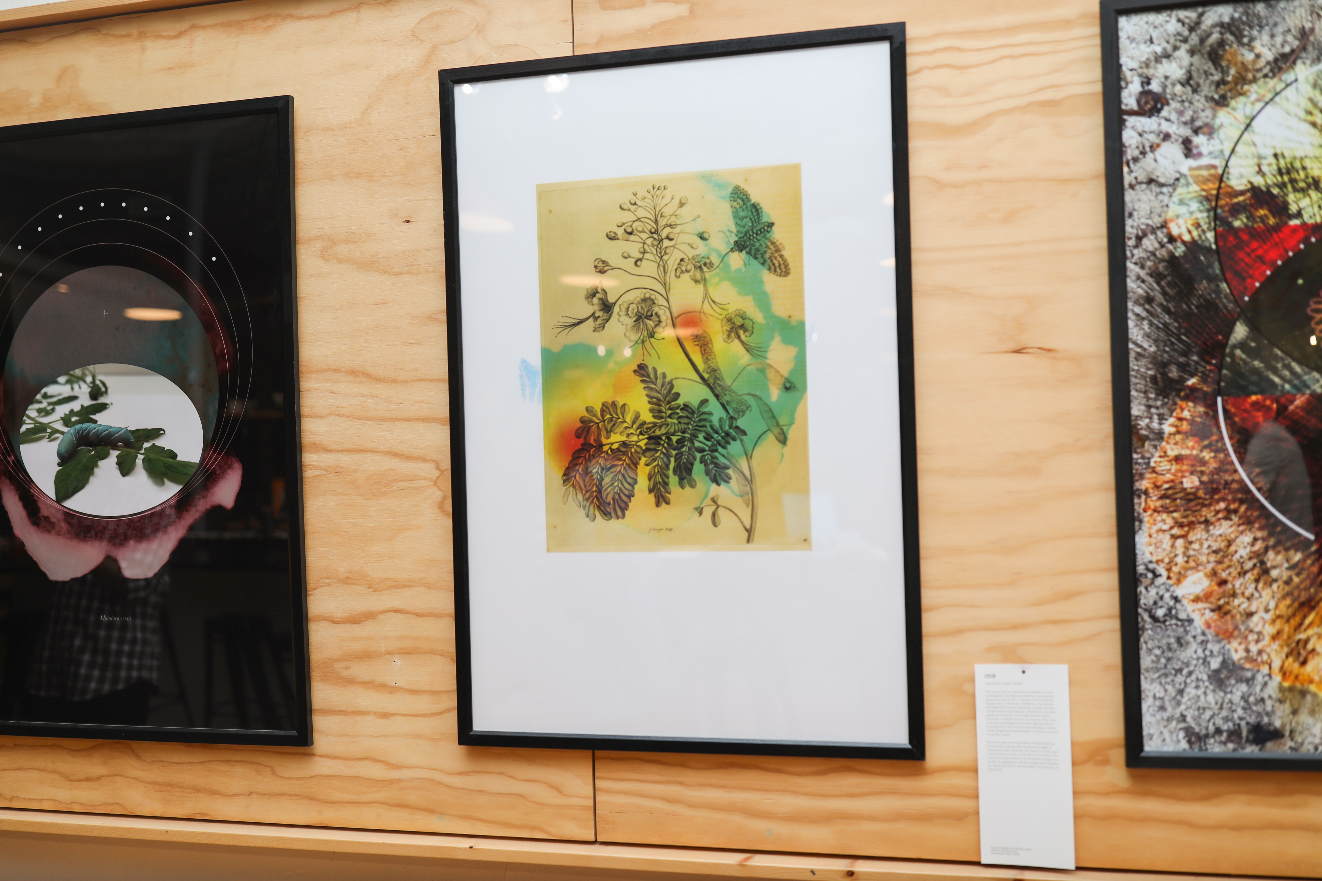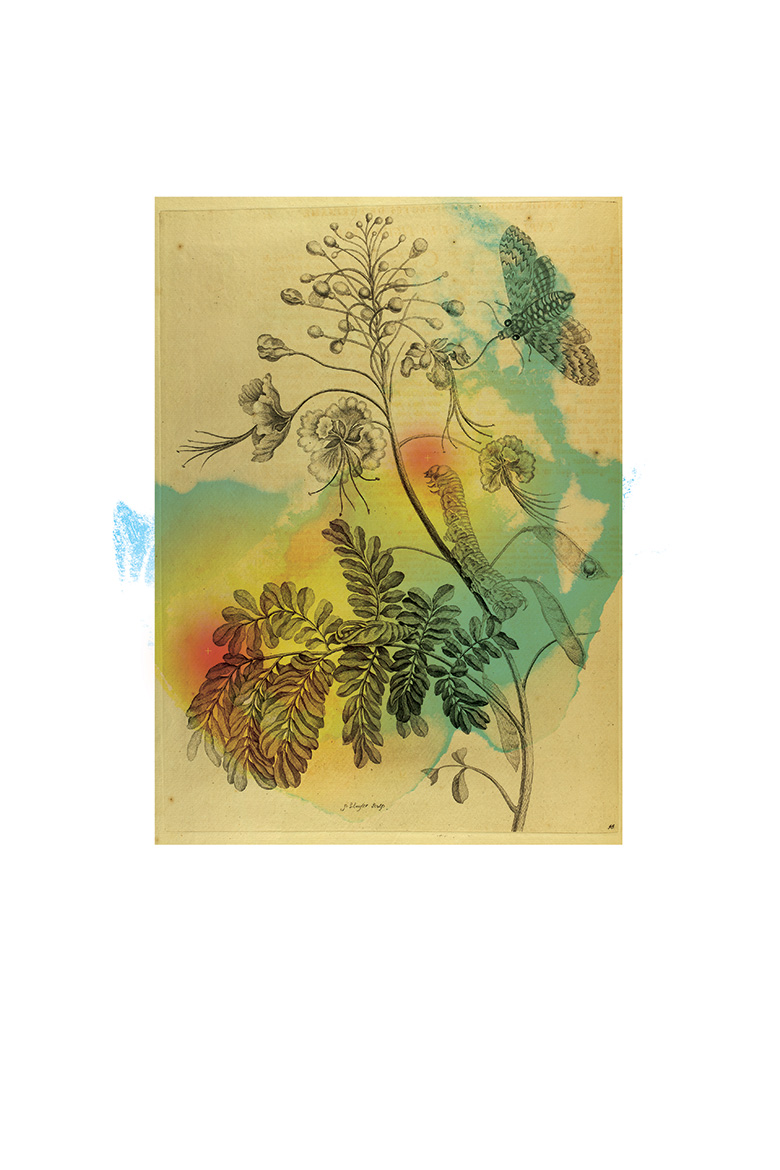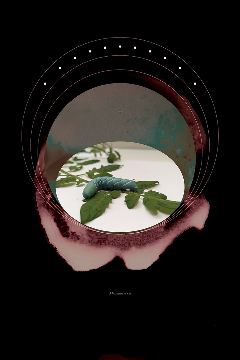 The two pieces are a nod to how far the field of entomology has progressed over the past 2000 years. Initial studies involved describing insects through drawings as seen in the print by Maria Sibylla Merian, a German entomologist and scientific illustrator. The original copy from the 1700s can be found at the Rare Book and Manuscript Library at the University of Illinois. The artist has treated the scan with ink stains and color blotches to highlight the volatile compounds that plants cast out into their environment. The paired image is a hornworm caterpillar on a tomato leaf surrounded by a color-inverted ink stain. The compounds have been highlighted to convey that researchers are still studying them to understand the full range of plant communication. Together, the pieces emphasize that the idyllic images we associate with nature are often combat zones, ripe with intrigue and deception.