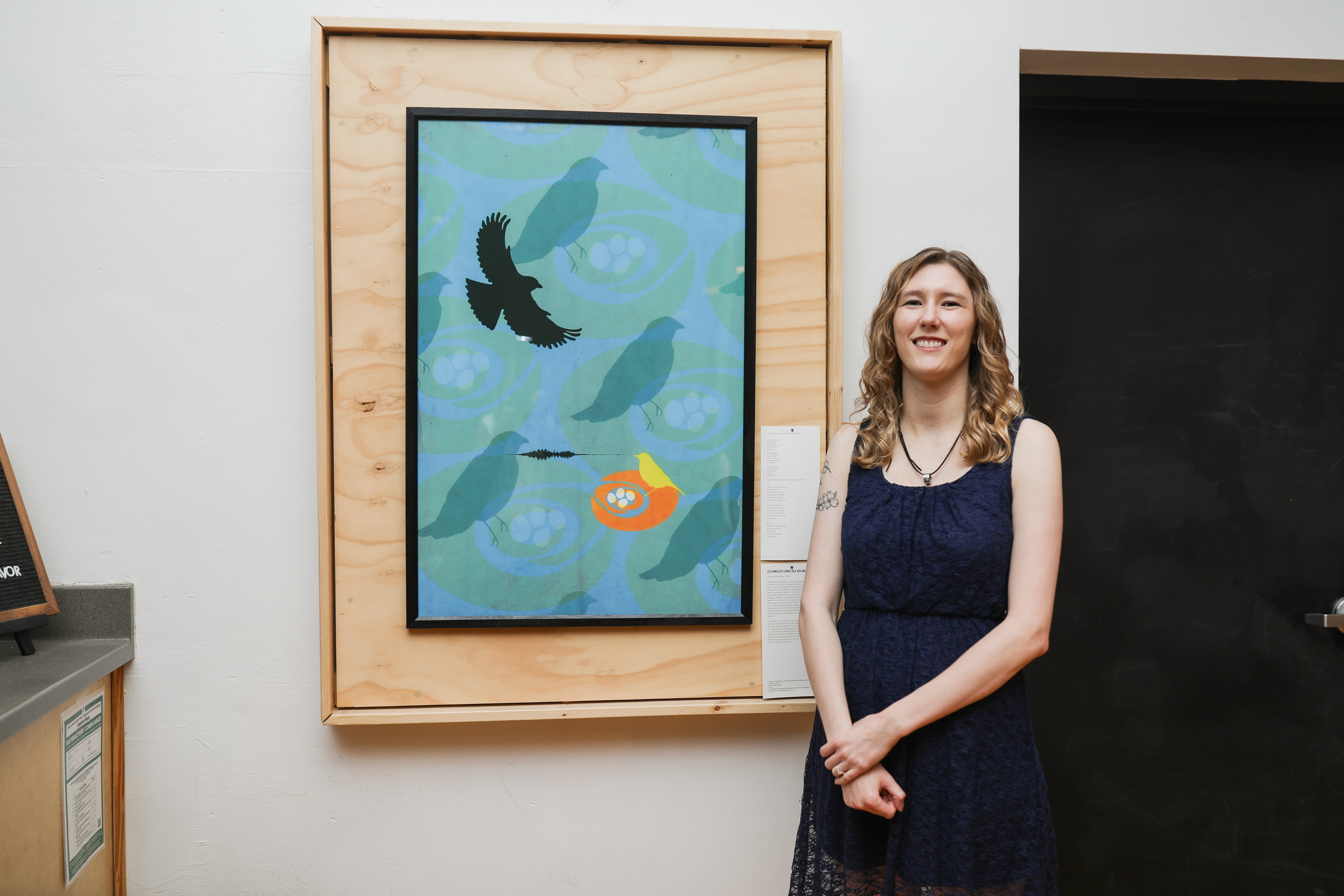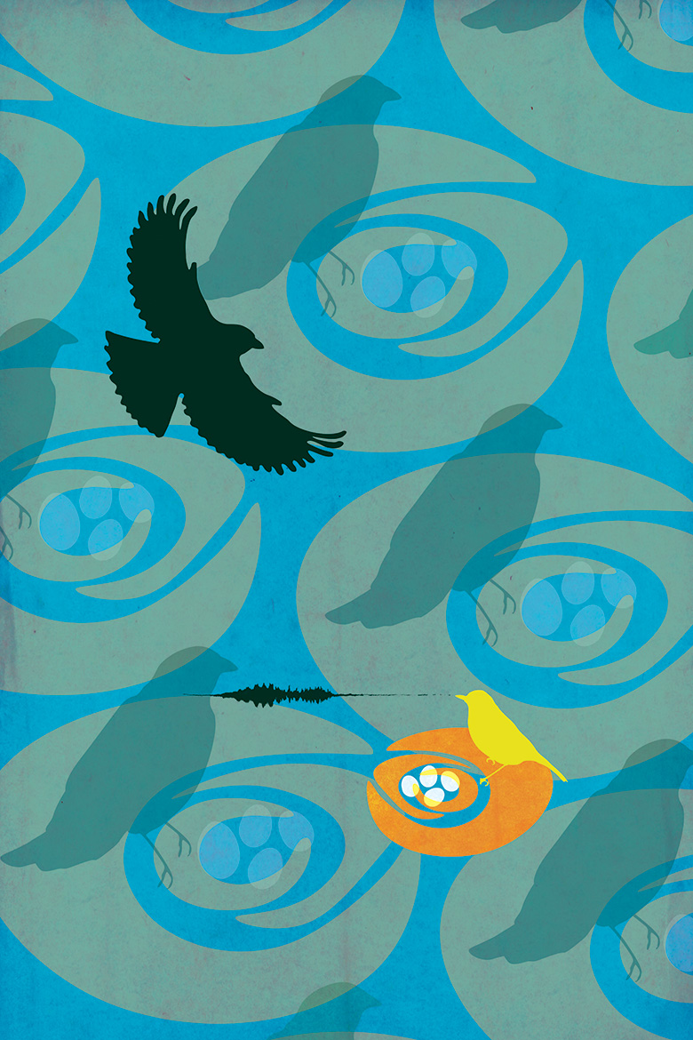 This conflict is portrayed through flattened forms and decorative patterns that are reminiscent of the work of Henri Matisse, a French visual artist. The highlighted standoff between the cowbird and the yellow warbler elevates the sense of drama–on one hand, the cowbird is adamant that its offspring receives the best care, and on the other, the indignant warbler sends out a war cry to its friends warning them to keep their guard up.