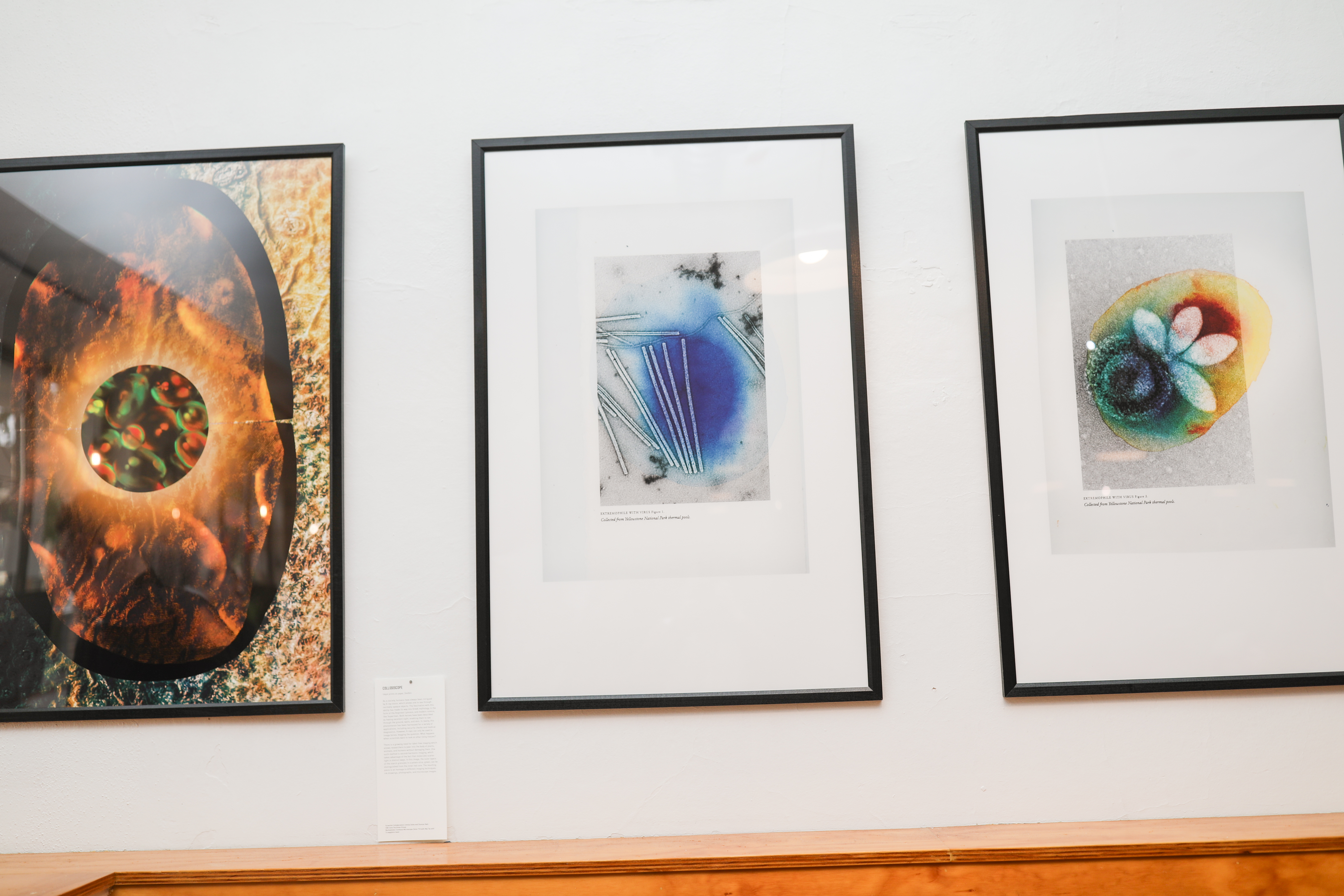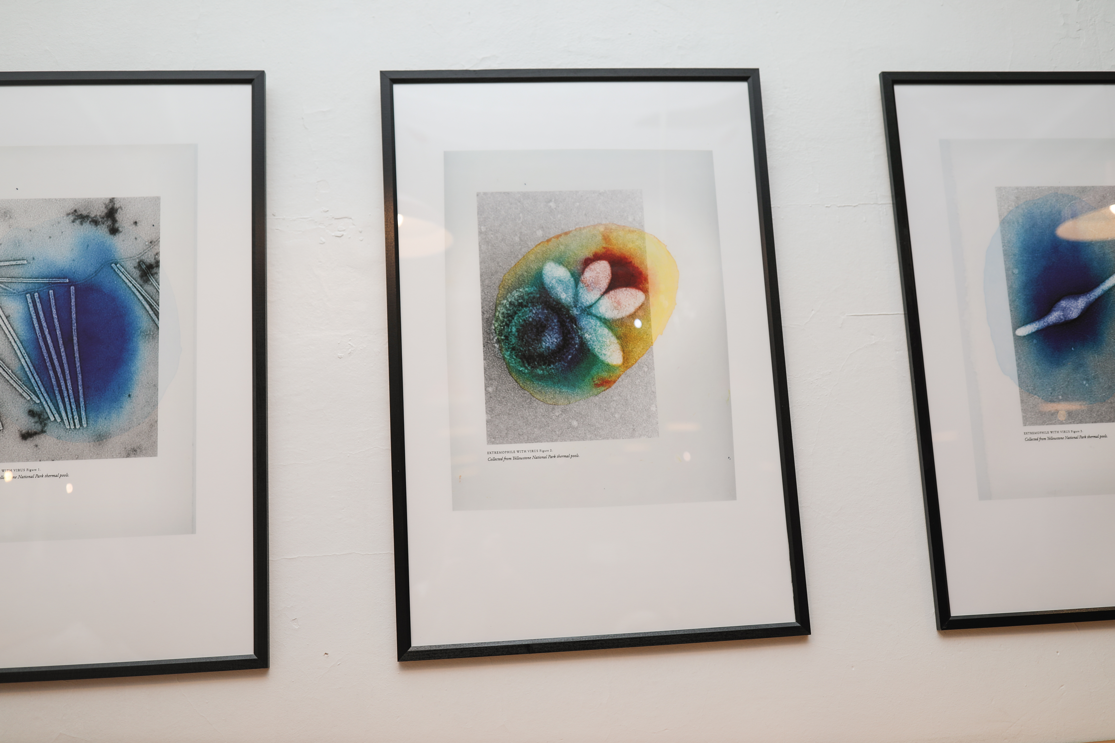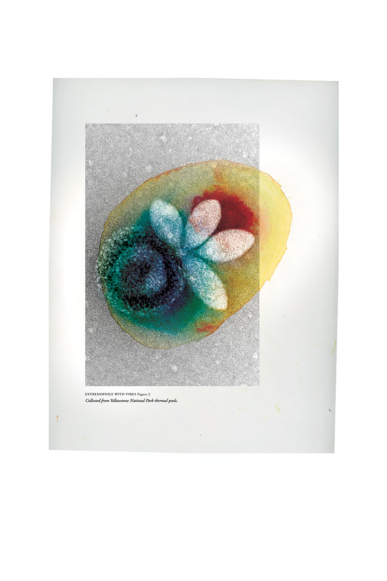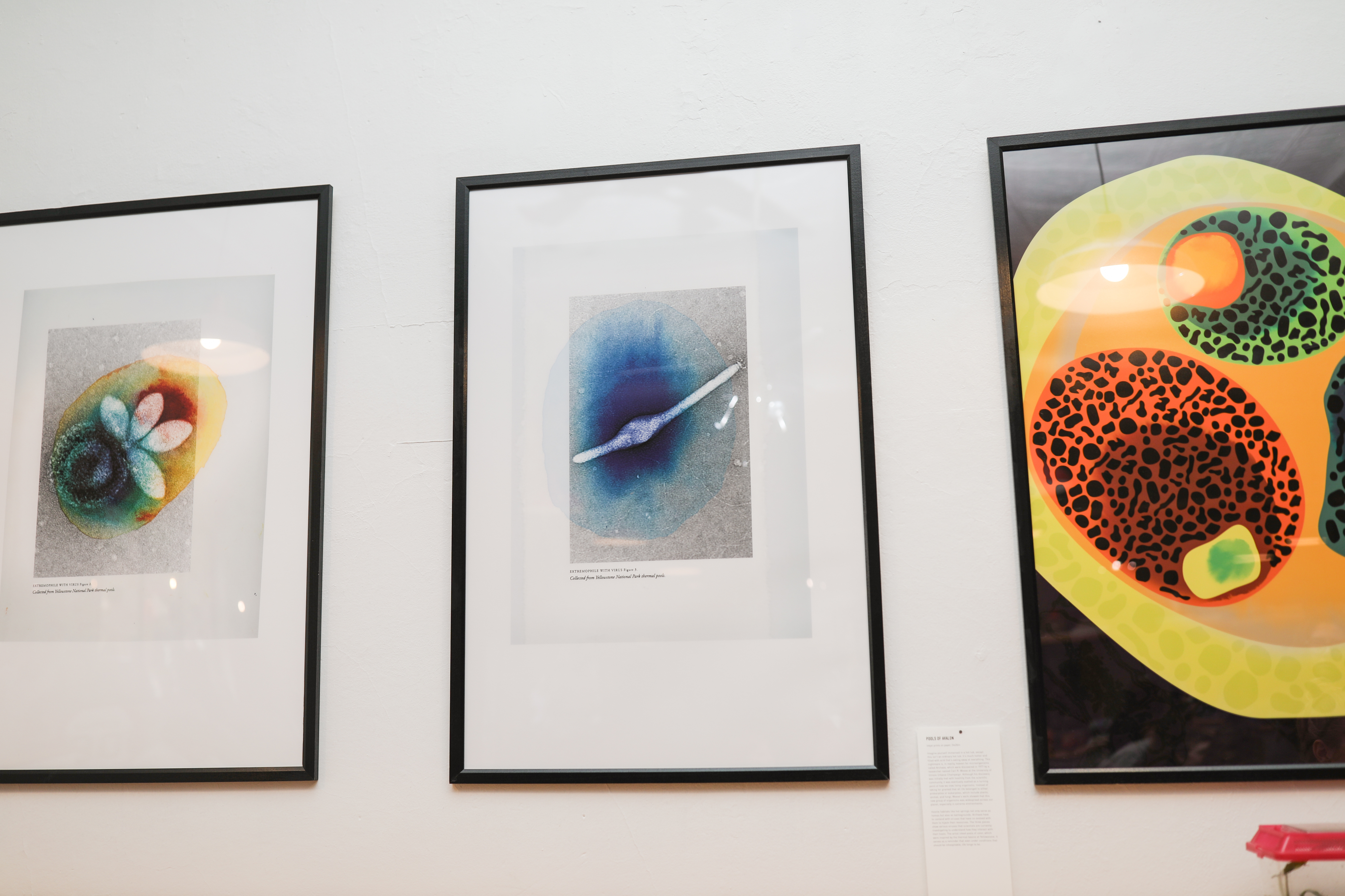 Hostile habitats like hot springs not only serve as homes but also as battlegrounds. Archaea have to contend with viruses that have co-evolved with them to hijack their resources. The three pieces show various viruses that scientists are currently investigating to understand how they interact with their hosts. The artist inked pools of color, which were inspired by the thermal basins at Yellowstone. It serves as a reminder that even under conditions that should be inhospitable, life longs for itself.