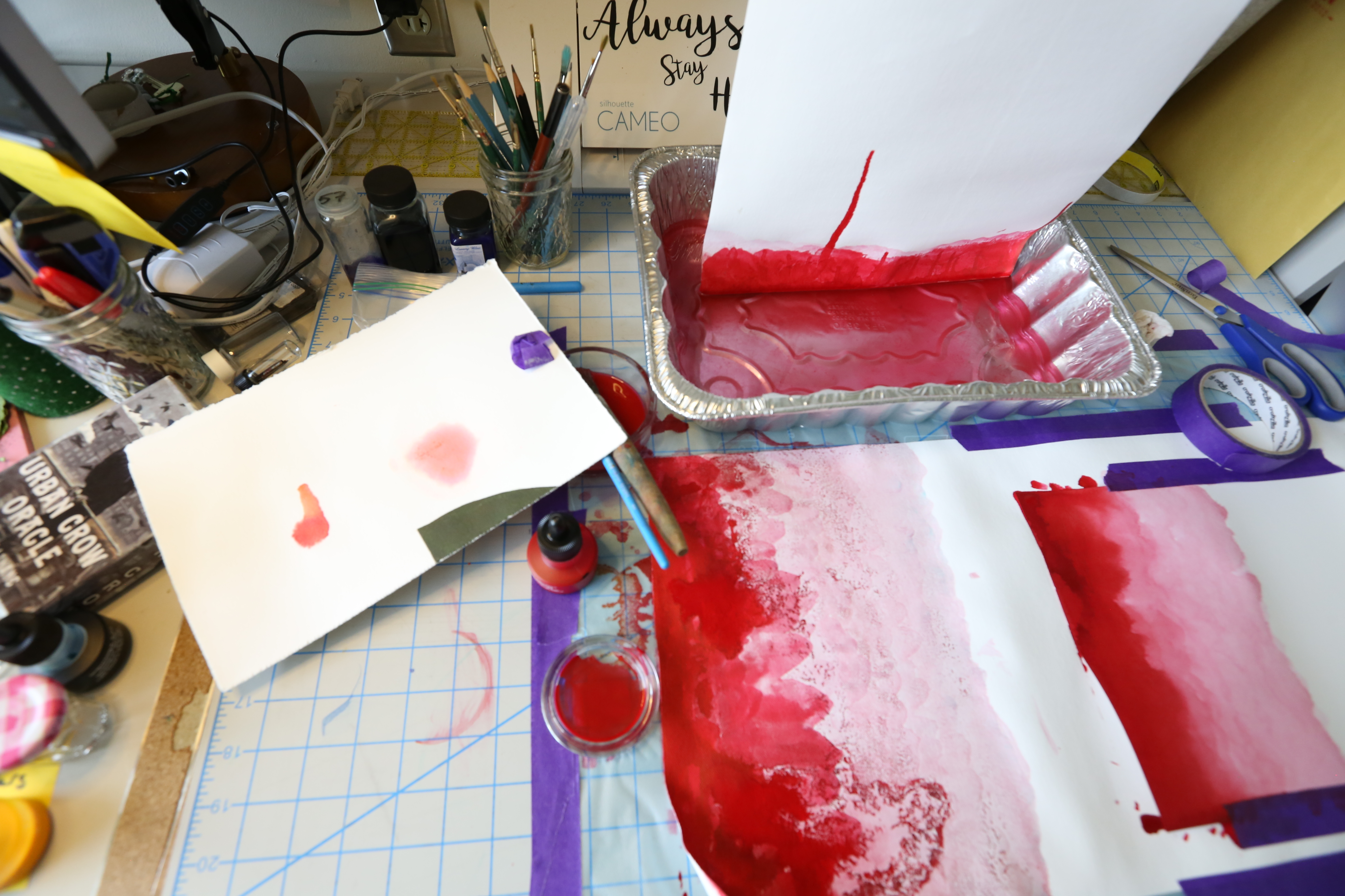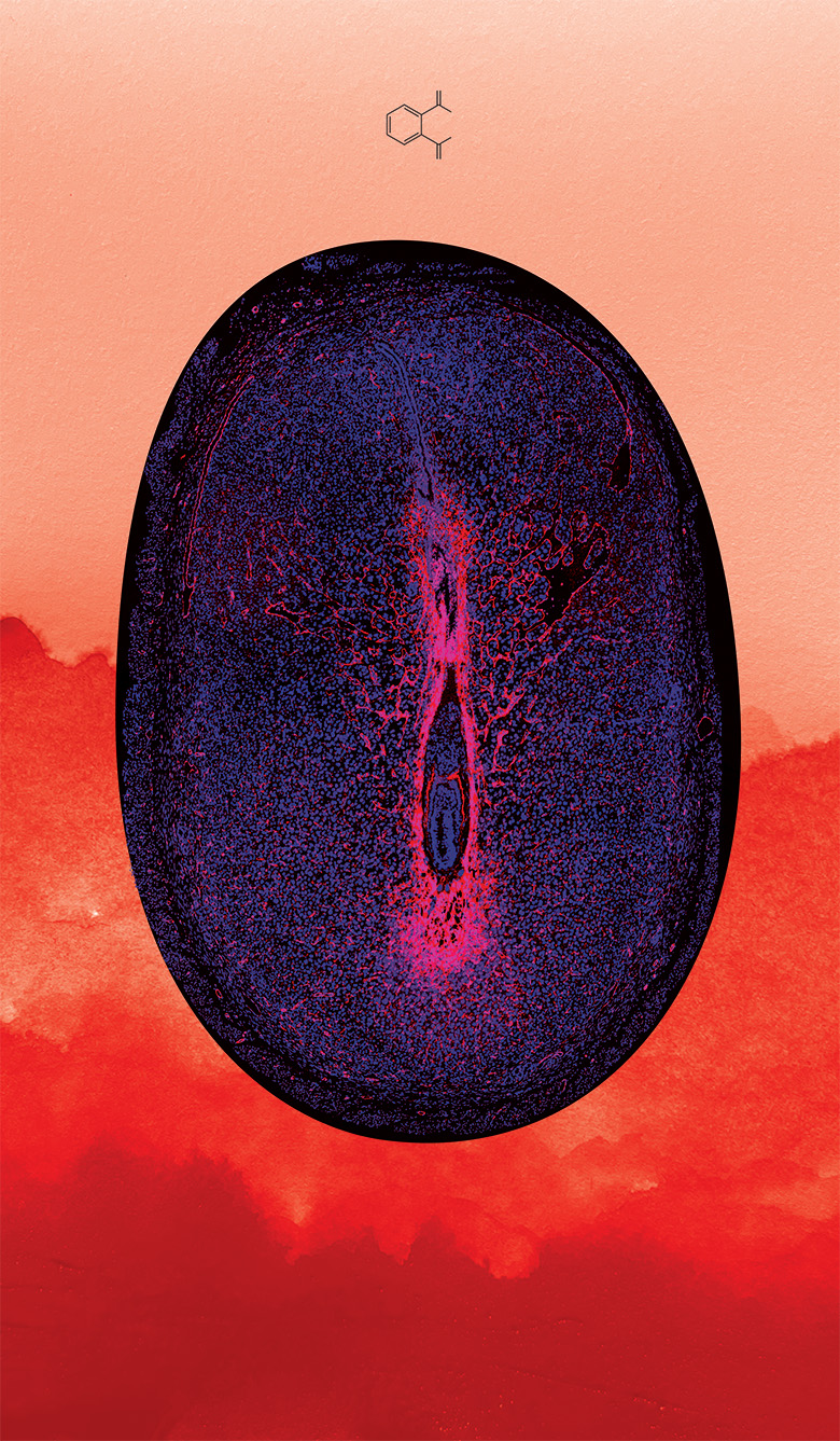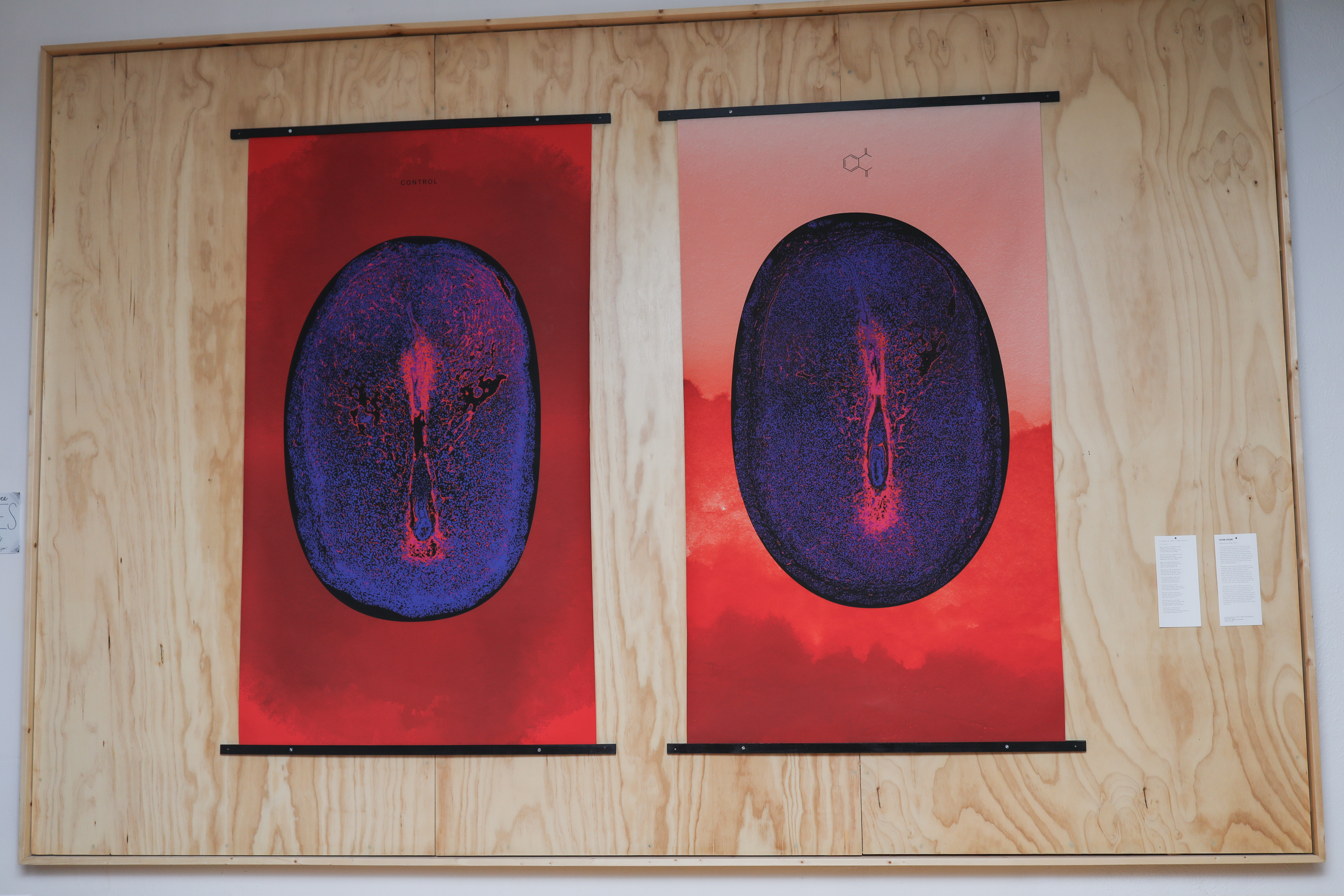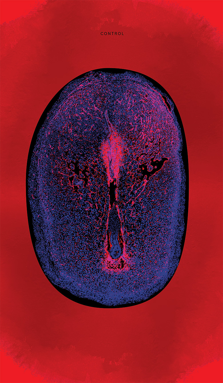 The banners have been created from data that compare tissue samples from pregnant mice that have been exposed to di-isononyl phthalates and those that have not. The background has been created as a visual extension of the data–the control has a deep-red ink stain to show the rich network of blood vessels while the phthalate-treated sample is washed out to mirror the decrease in blood vessels. The images serve as a reminder that although modernization solves many problems, it also creates novel ones.