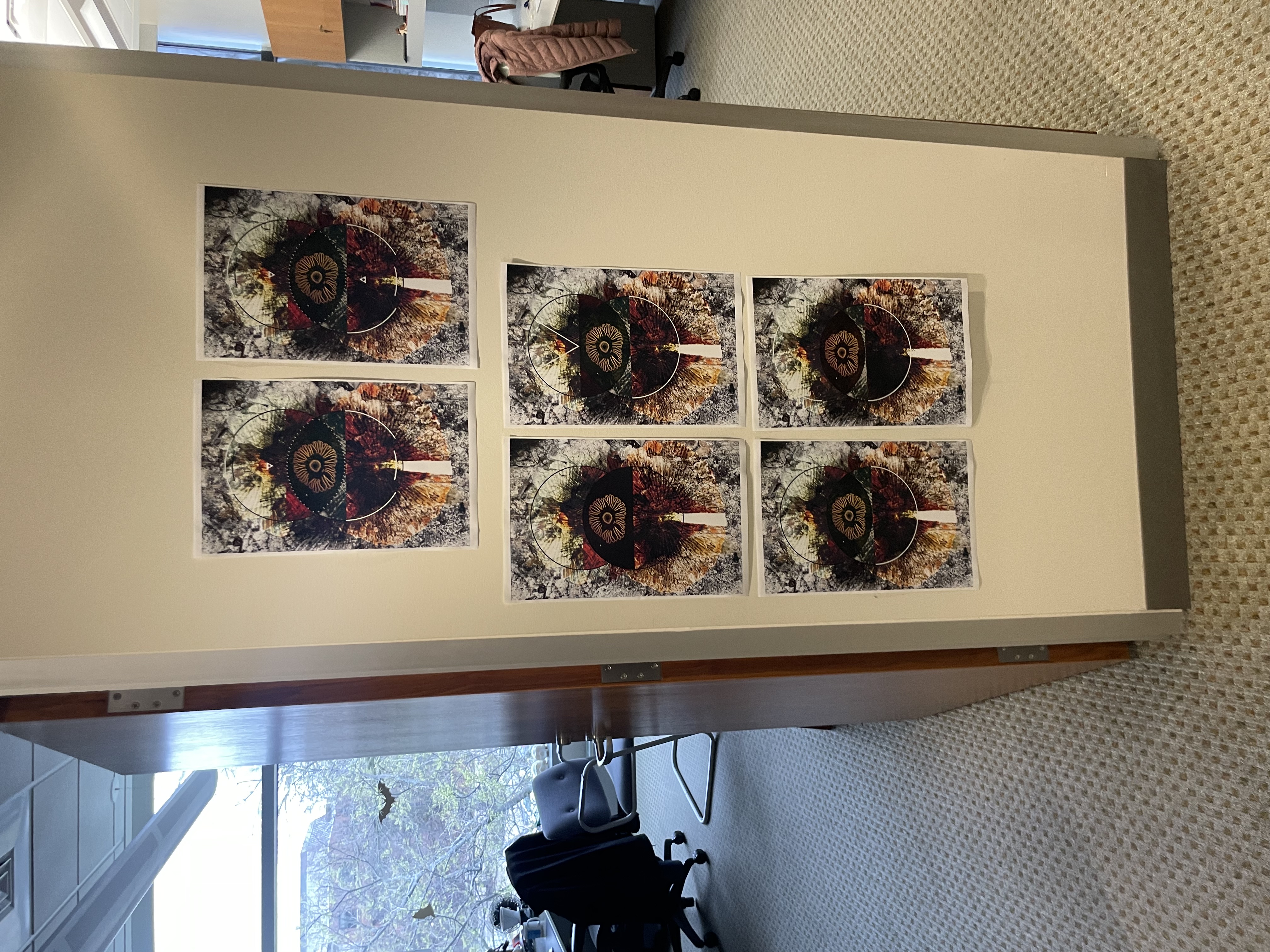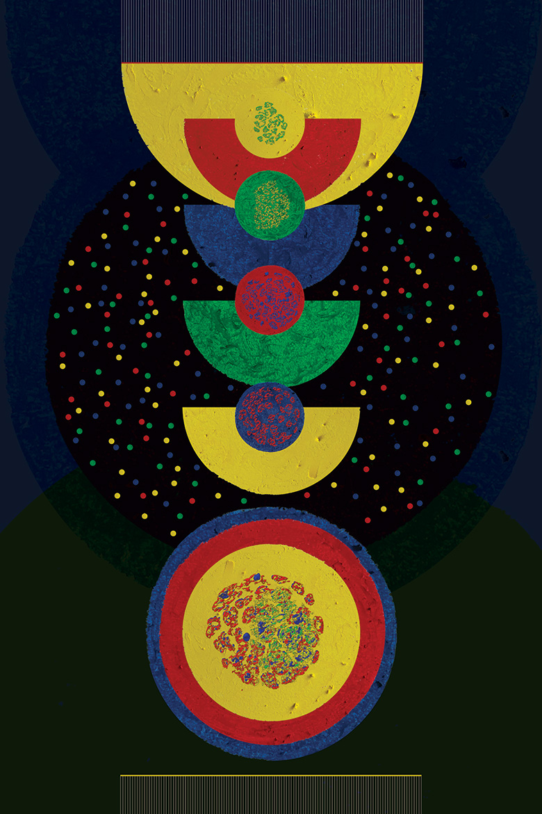 The artist addresses this mathematical conundrum by drawing inspiration from liver studies because it is the only organ in the human body that can do the impossible–it can regenerate almost completely after being damaged. Scientists are now trying to understand what factors affect liver development to create better models for liver disease. The fidget- spinner shapes are slices of a growing liver that have been stained in red, blue, and green. The background has been created by adding photographs that the artist took of the recent solar eclipse. Taken together, the piece represents hope in the face of an insurmountable challenge.