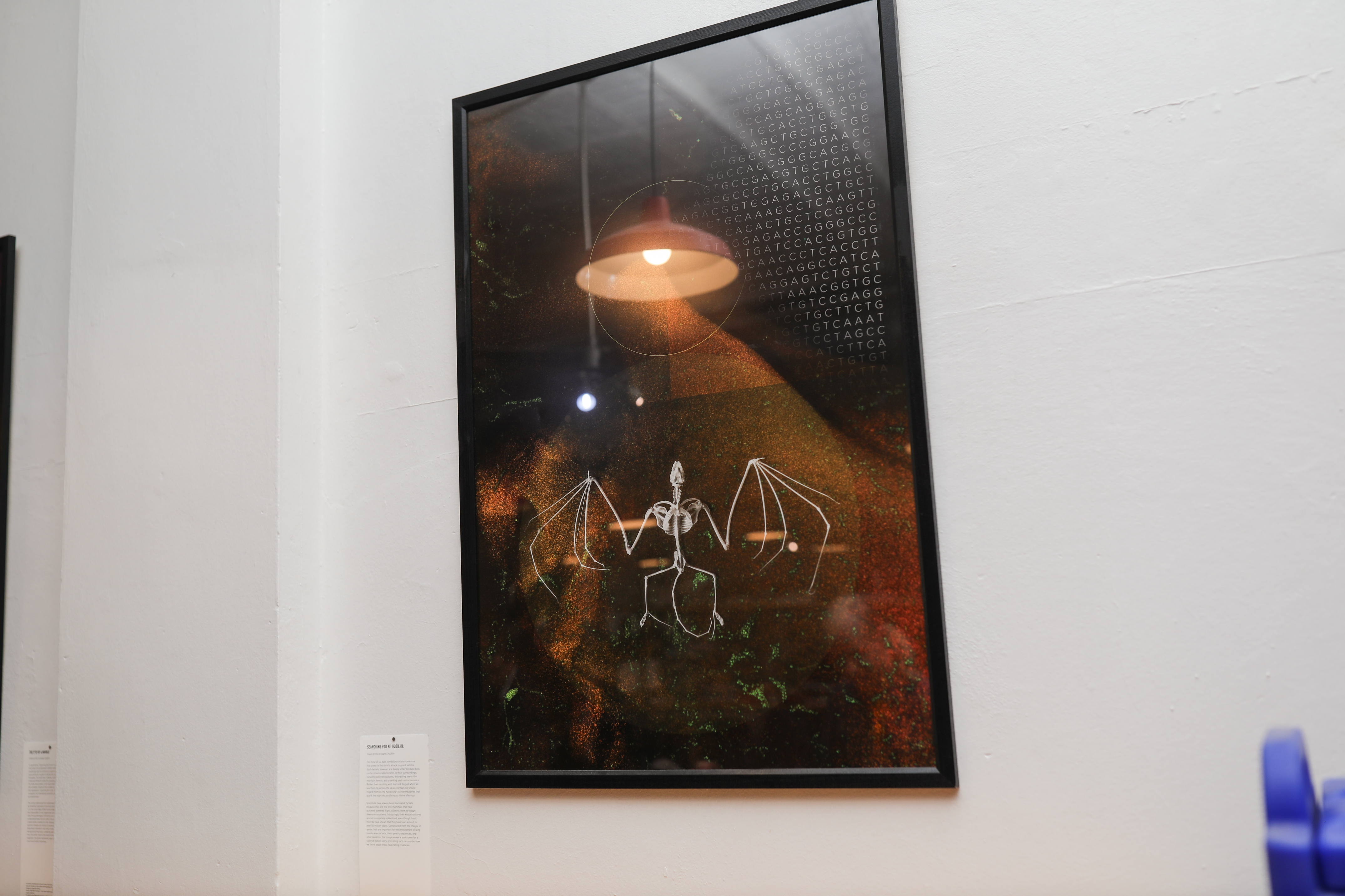 Scientists have always been fascinated by bats because they are the only mammals that have achieved powered flight, allowing them to occupy diverse ecosystems. Intriguingly, their wing structures are not completely understood, even though fossil records have shown that they have been around for over 50 million years. Constructed from the images of genes that are important for the development of wing membranes in bats, their genetic sequences, and a bat skeleton, the image evokes a book cover for a science fiction story, prompting us to reconsider how we think about these fascinating creatures.