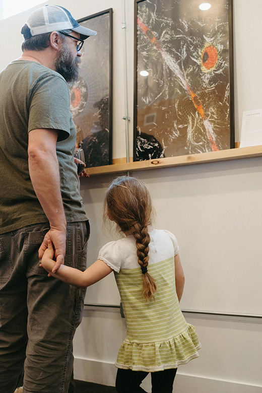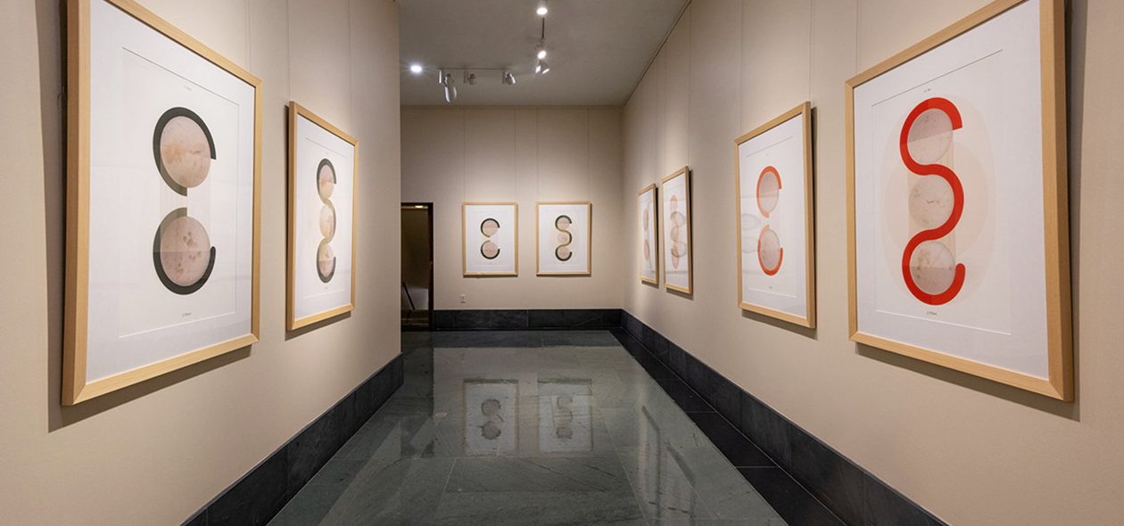 The fertilized egg begins its existence in a state of transience, migrating from the fallopian tube to the uterus. Its survival depends on preparations that predate conception: the inner lining of the uterus thickens, the cells multiplying in preparation for a zygote that may never arrive. If it does, the uterine lining will provide it with a place to anchor and the nutrients it needs to grow. If it does not, the lining will be shed and the reproductive cycle will resume. A symphony of hormonal signaling leads the uterine lining’s cellular dance of proliferation and loss. The artist used pen and ink to draw the viewer into these hidden spaces, defined by what is absent as much as what is present, empty but loaded with potential.