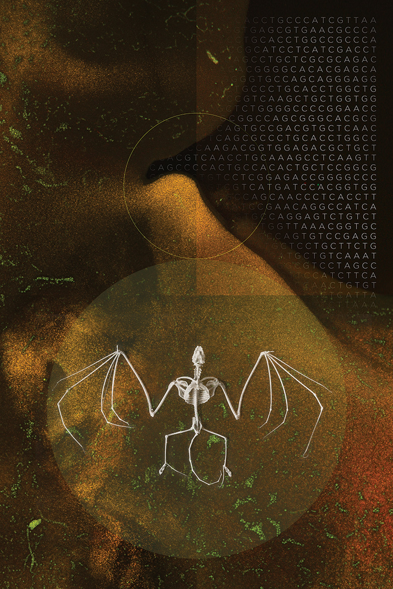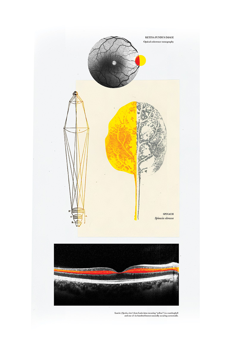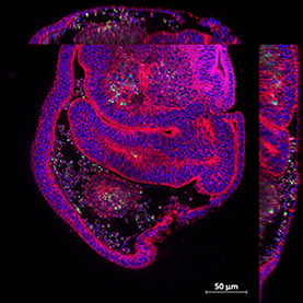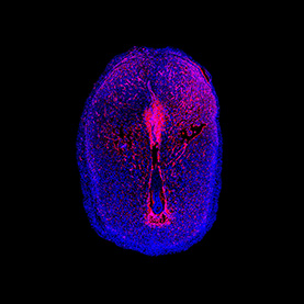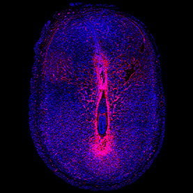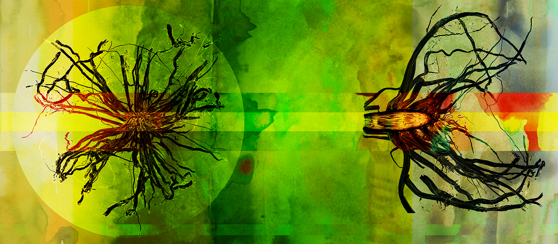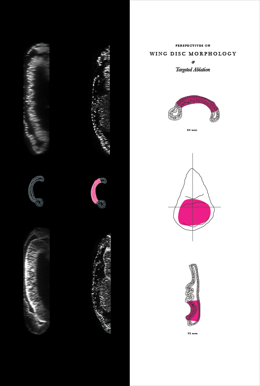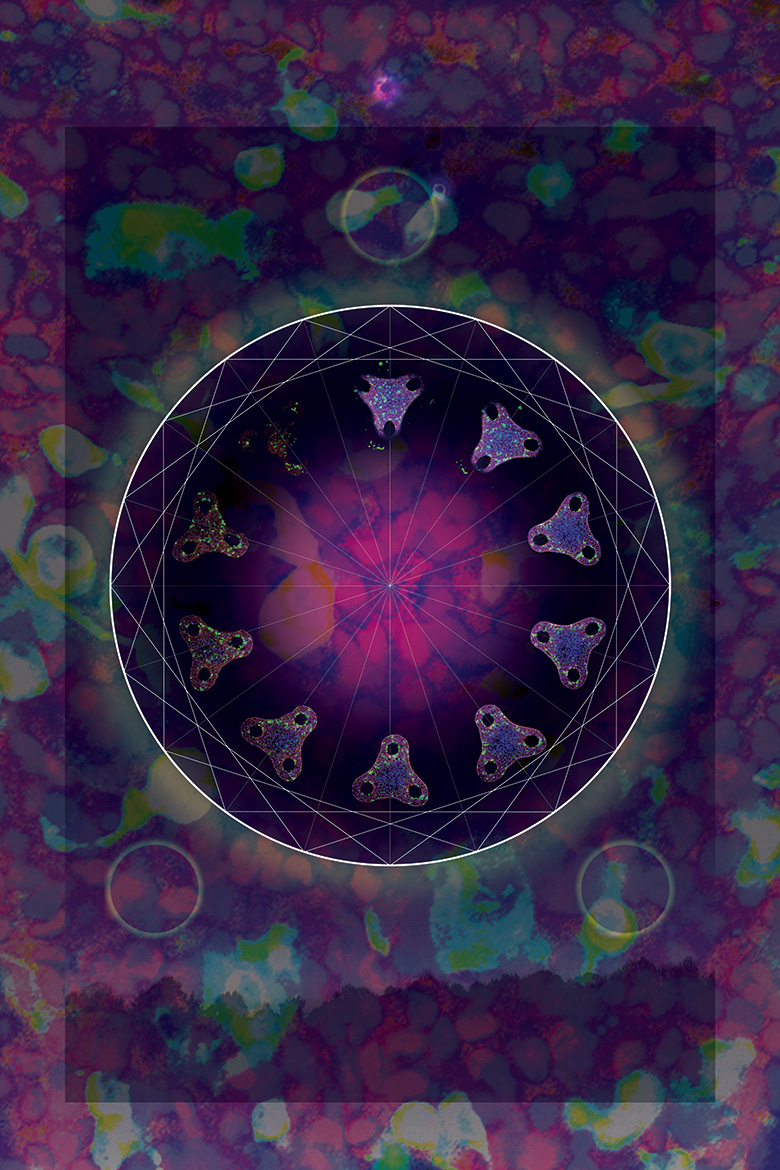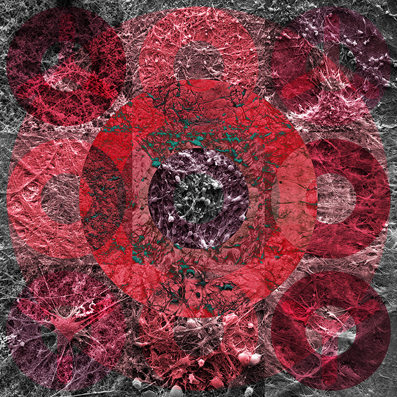 In the study that produced these images, researchers triggered a genetic process that killed cells within the wing imaginal discs of fruit flies. By imaging cross-sections of the recovering imaginal disc, they tracked how the remaining cells—highlighted by their blue centers and magenta outlines—cleared away the debris and repaired the injury. In the final piece, the artist has wrought targeted destruction to reveal hidden processes; a carefully structured order lies beneath seeming disorder.