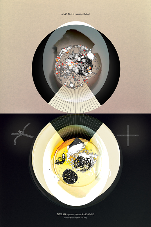 Inspired by the style of Hilma af Klint, the artist has accentuated the polarity of the data, mapping the contrasting scientific images in opposition to each other. When the red viral particles roam free, the cell membrane is vulnerable to the virus, with its penetrability represented by a superimposed image of a broken egg shell. In contrast, when restrained and shielded in the claws of the NanoGrippers, the red virions disappear as SARS-CoV-2 is rendered inactive and unable to enter the cell to cause infection—the egg shell left intact. In the arms race against viruses, perhaps we can rig the game after all through the development of these precision molecular machines.