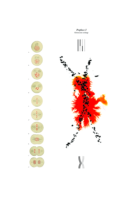 Through these pieces, the artist highlights meiosis, its many stages, and the evolution of the technologies that let us observe it. The imagery captures prophase I of meiosis in super resolution, zoomed in 100,000 times smaller than a human hair. As the cell prepares for meiotic dormancy, threads of DNA are organized and stabilized in a process choreographed by proteins seen here in fluorescent shades . As scientists visualize meiotic processes, they gain insights into infertility, miscarriages, and genetic disorders in pursuit of improving reproductive health and public health outcomes.