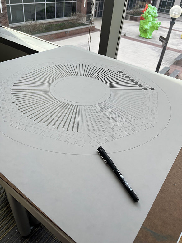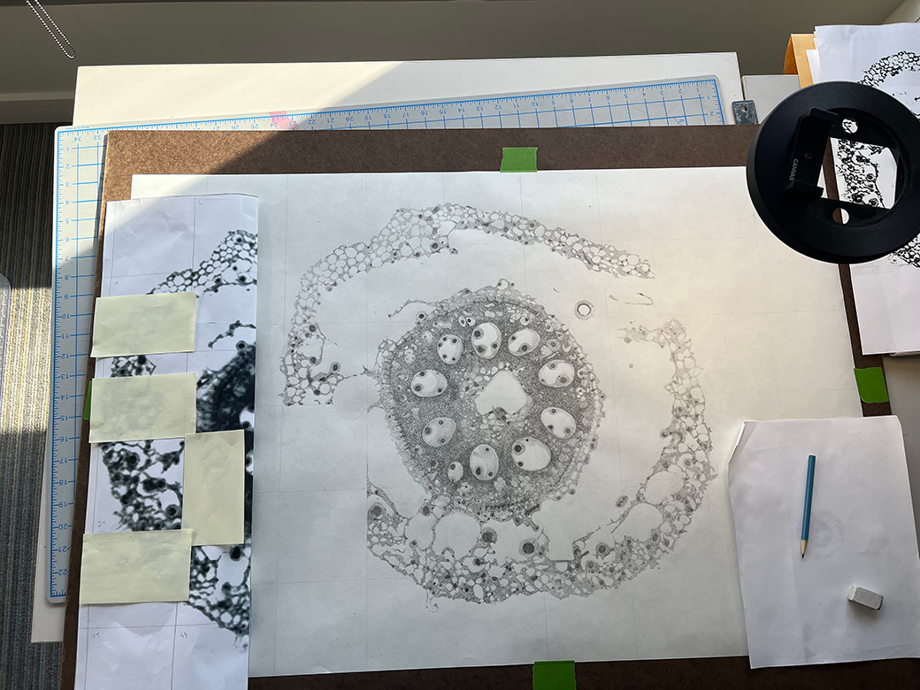 In this hand-drawn piece, the artist pays homage to the beauty of resilience. Each precise mark of charcoal comes together to showcase the intricacies in the cross section of the corn root. As you examine the shapes and patterns embedded in the tissue slice, also take notice of the empty space. During drought conditions, the aerenchyma degrades so the plant can save energy and redistribute its power to maintain growth patterns. Fragmented or whole, the corn plant adapts and lives on in a true testament to endurance through flexibility and endurance.