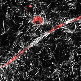 The images depict the mechanical interactions of colorectal cancer-associated fibroblast cells (CAFs) as they mechanically change the tumor microenvironment, thereby facilitating cancer cell migration. With the layering of force diagrams and meshes, the artist highlights the tension the red stained CAFs apply to nearby cells. While the collagen fibers between the cells are stretched to form a thick white band, the surrounding fibers buckle from this tensile force. Going forward, these fundamental studies exploring the forces at play in the tumor microenvironment are the first push in a cascade of further research, with the goal to eventually develop improved cancer therapeutics.
