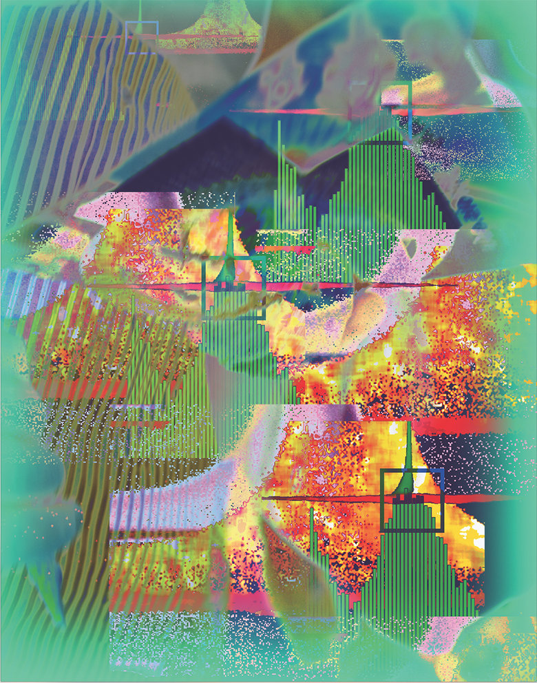 Work with microscopes typically relies on the intensity of emitted or reflected light. A method called fluorescence lifetime imaging microscopy is different, focusing instead on how quickly emitted light disappears. The rising and falling patterns in this image are derived from the lifetimes of fluorescent light emitted by reactants and products as they swirl together inside a tiny network of channels, providing a novel view of how these molecules interact.