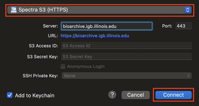 ​After your first connection to Bioarchive, you will not be asked for the S3 Access ID and S3 Secret Key again if you connect from the same Biocluster account.