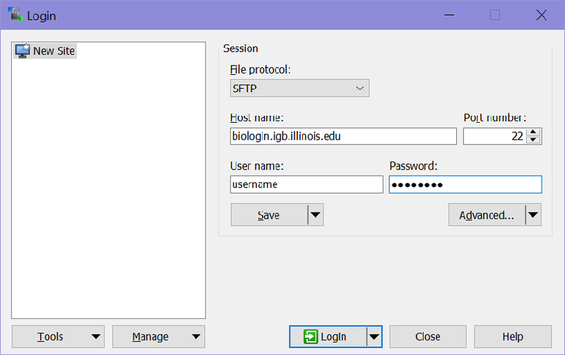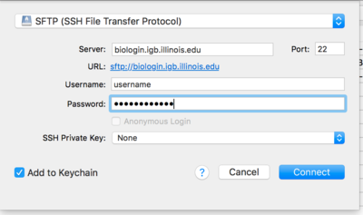 - In the Server box, enter biologin.igb.illinois.edu and for the Username and Password fields, enter your IGB credentials.