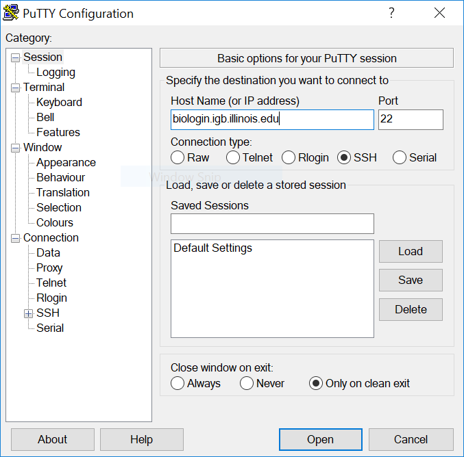 - Install Putty and run it, in the Host Name input box enter biologin.igb.illinois.edu